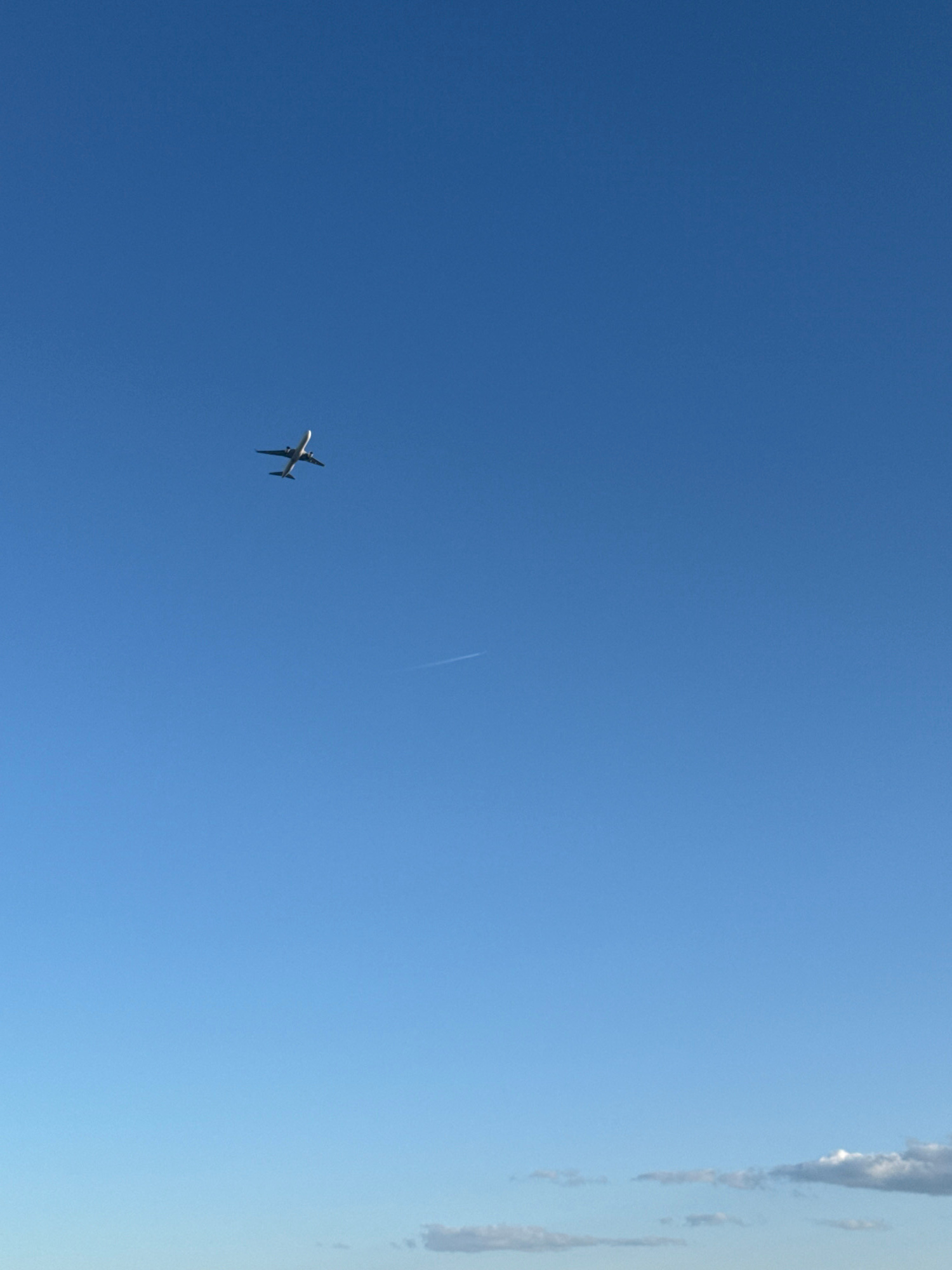 The image shows a clear blue sky with an airplane in the lower left corner. A thin contrail is visible in the upper center of the frame. There are some clouds on the upper right edge of the image. The…read more