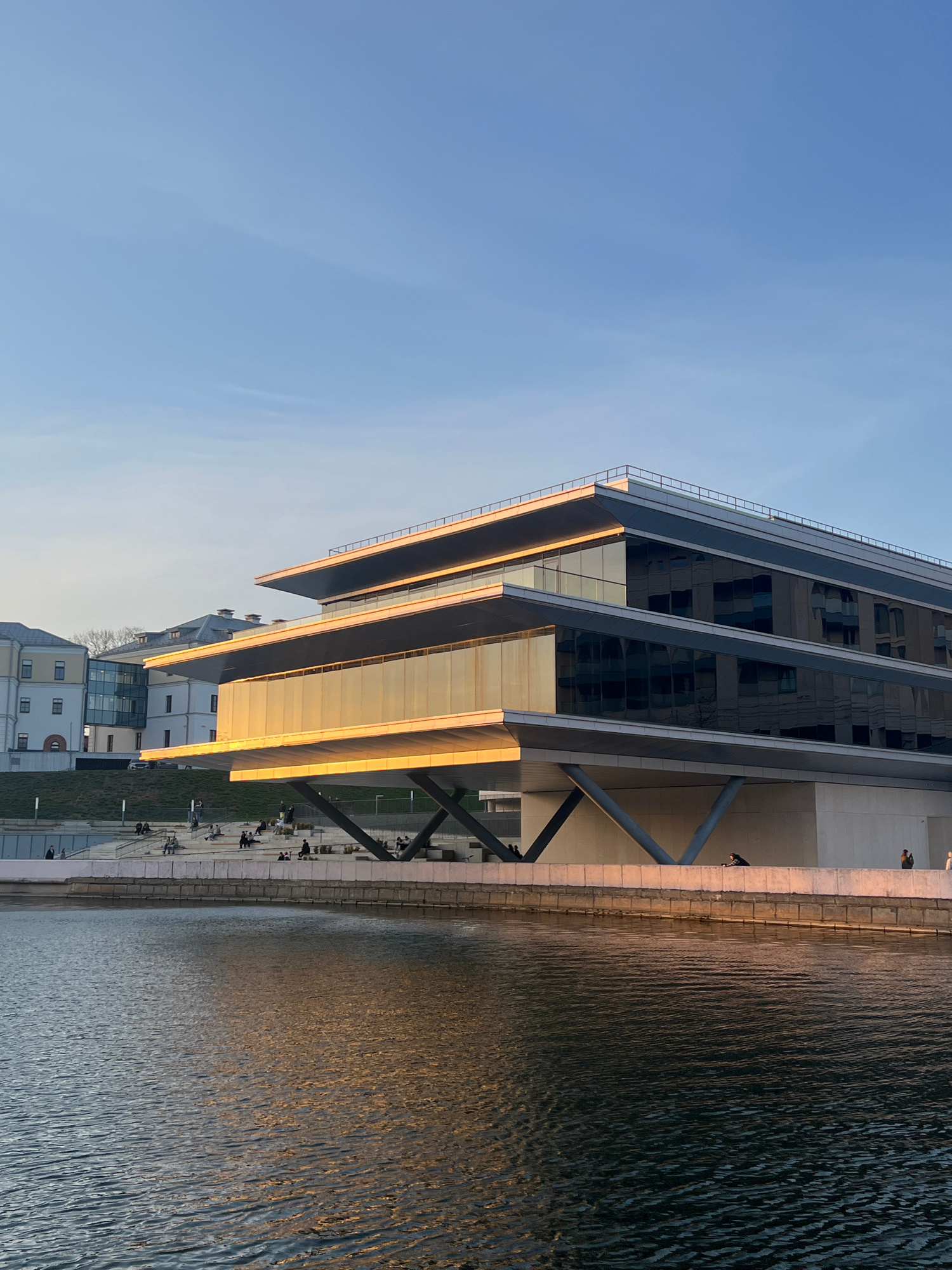 The image shows the National Library of Belarus in Minsk. The building, a modern architectural structure, is positioned next to a body of water, possibly the Svislach River. The library has a distinct…read more