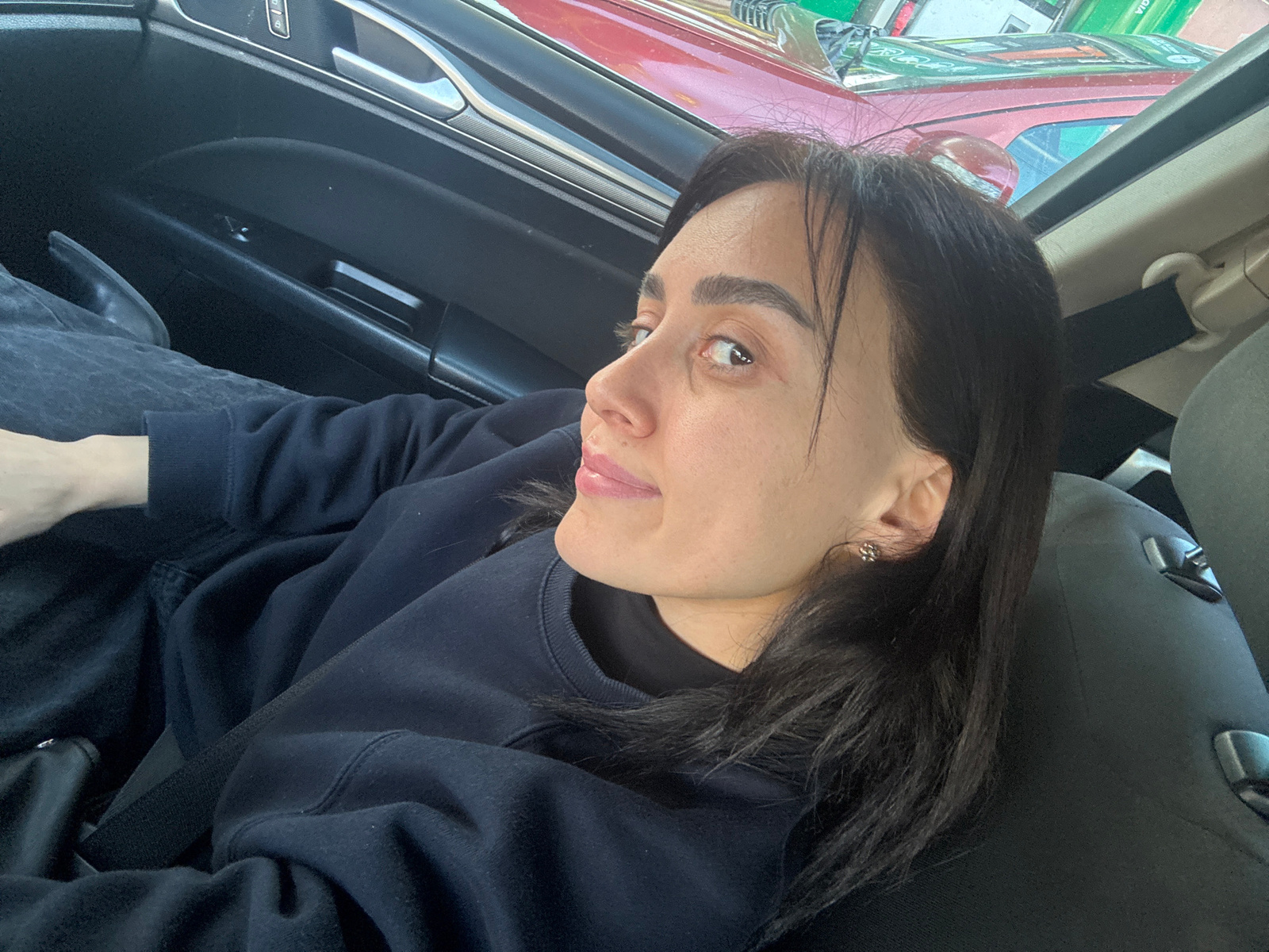 A woman with dark hair is wearing a dark blue sweatshirt and a seatbelt in the driver's seat of a car. The car is parked on a street in Tbilisi, Georgia, where red and green vehicles are visible outsi…read more
