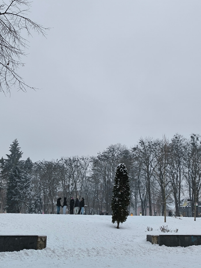 The image displays a snow-covered urban park in Vinnytsia, Ukraine, under a uniform overcast grey sky. The ground is uniformly covered in white snow. In the immediate foreground, two dark, rectangular…read more