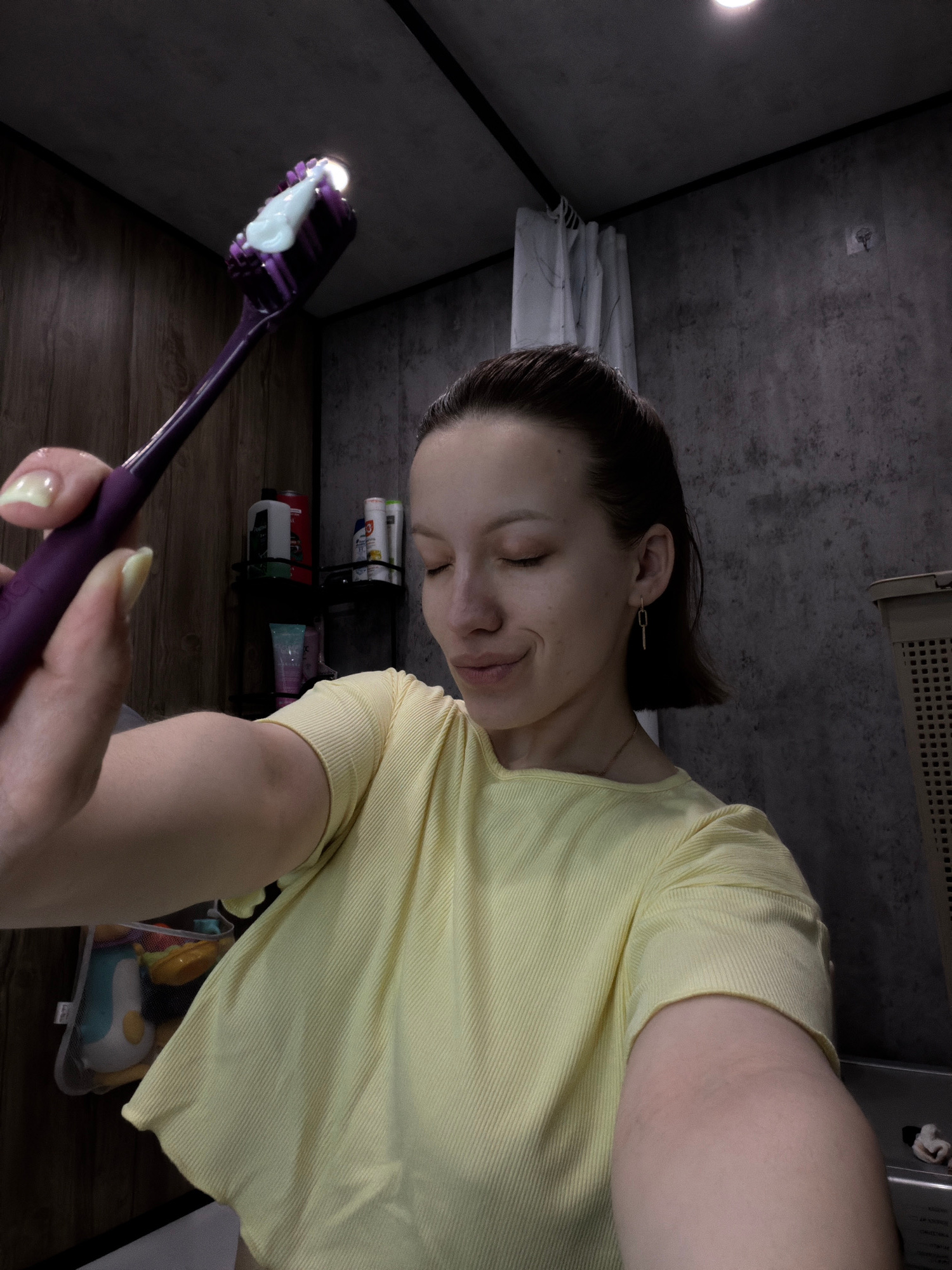 A woman is holding a purple toothbrush with white toothpaste in a bathroom. The bathroom has gray walls and wooden flooring. A shelf holding toiletries is visible in the background. The woman is weari…read more