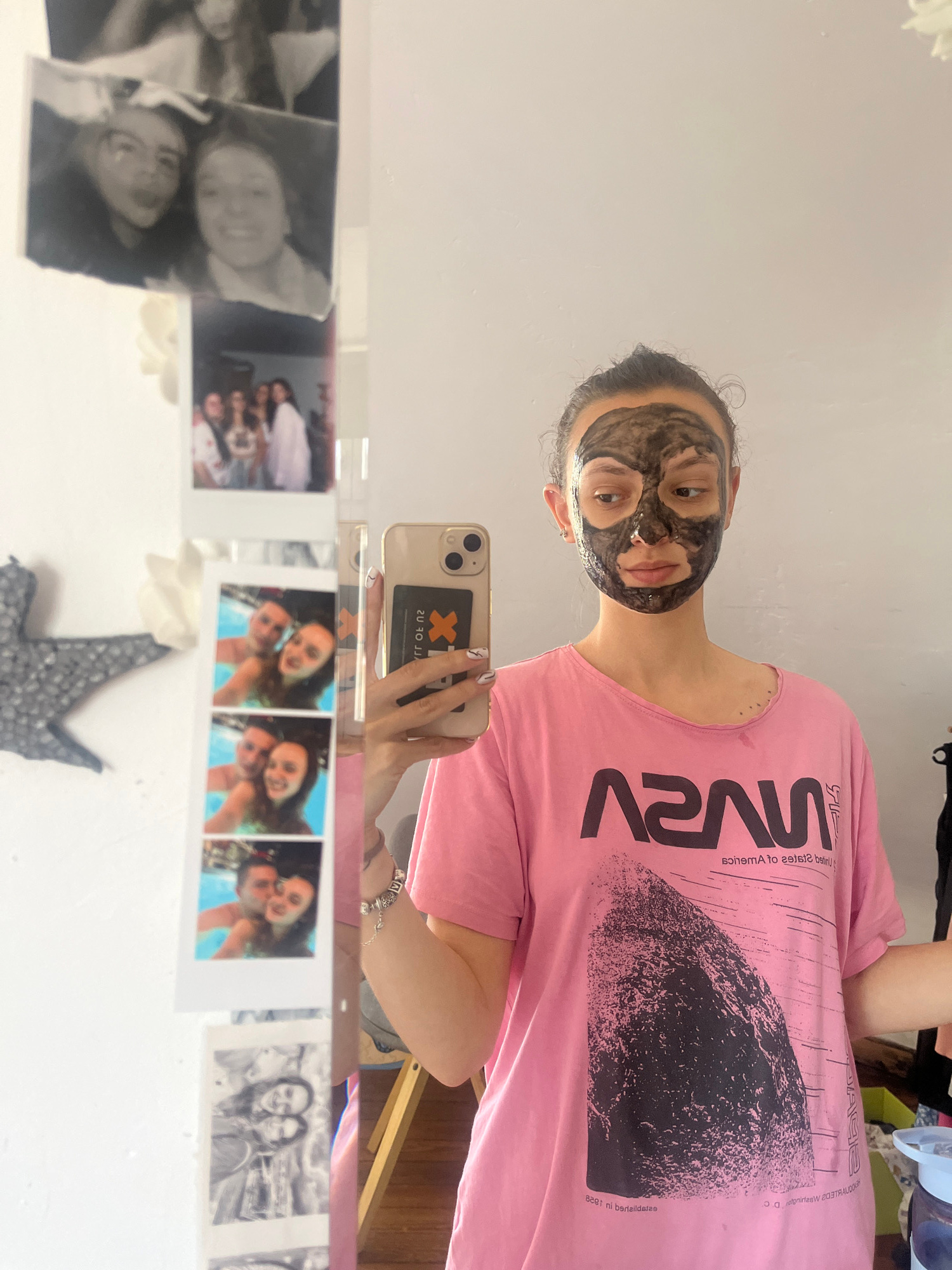 A young person with a facial mask stands in front of a mirror, taking a selfie with a gold-colored iPhone. The person is wearing a pink NASA t-shirt. The mirror reflects the person and their surroundi…read more