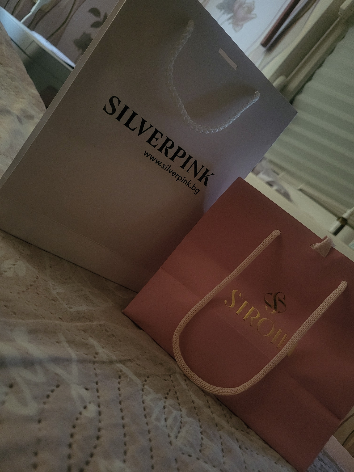 Two shopping bags, one light grey and one pink, are prominently displayed at an angle on a textured, light-colored fabric surface, possibly a bedspread or blanket. The setting appears to be indoors, l…read more