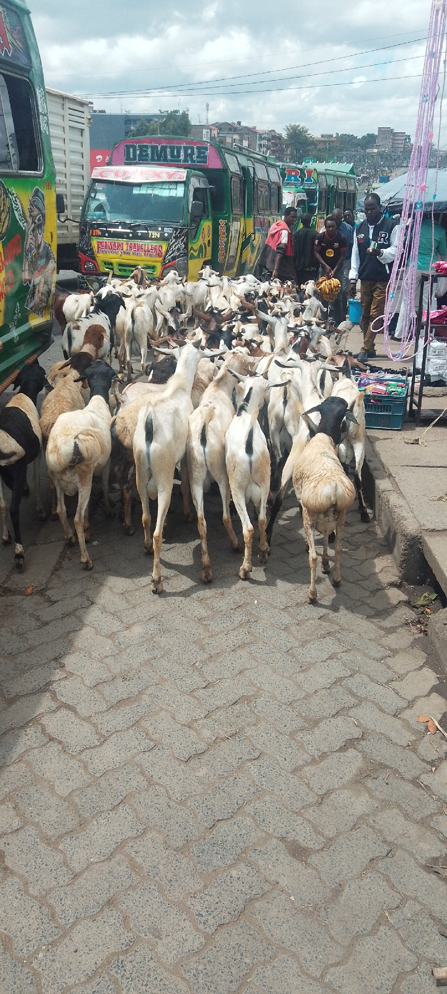 The image shows a bustling street scene, likely a market area, in Nairobi, Kenya. A large herd of goats occupies the street, viewed primarily from the rear. Some goats are white, while others have varβ¦read more