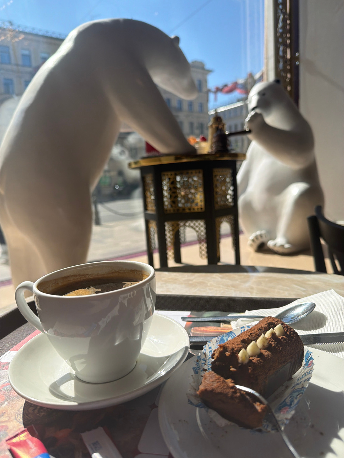 This media file captures a bright daytime scene inside what appears to be a cafe or restaurant, offering a view of an urban landscape through a large window. In the foreground, a white ceramic coffee…read more