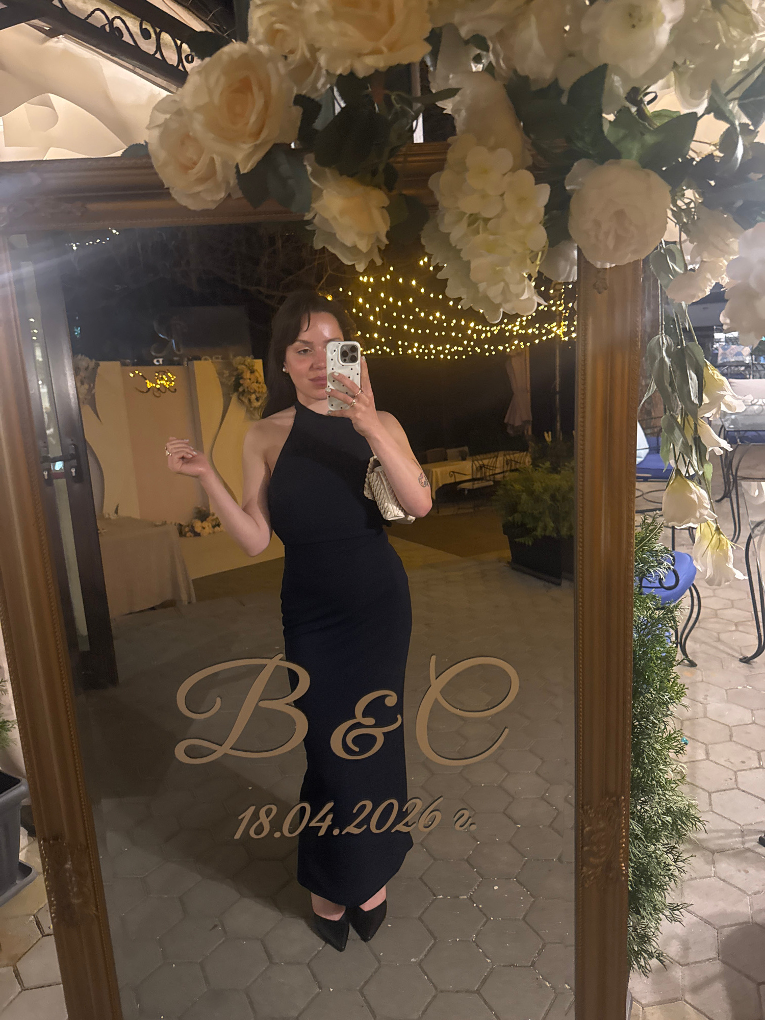 A woman is taking a selfie in a large mirror in Blagoevgrad, Bulgaria. The mirror is decorated with white flowers and greenery. Reflected in the mirror are outdoor lights and buildings. In the reflect…read more