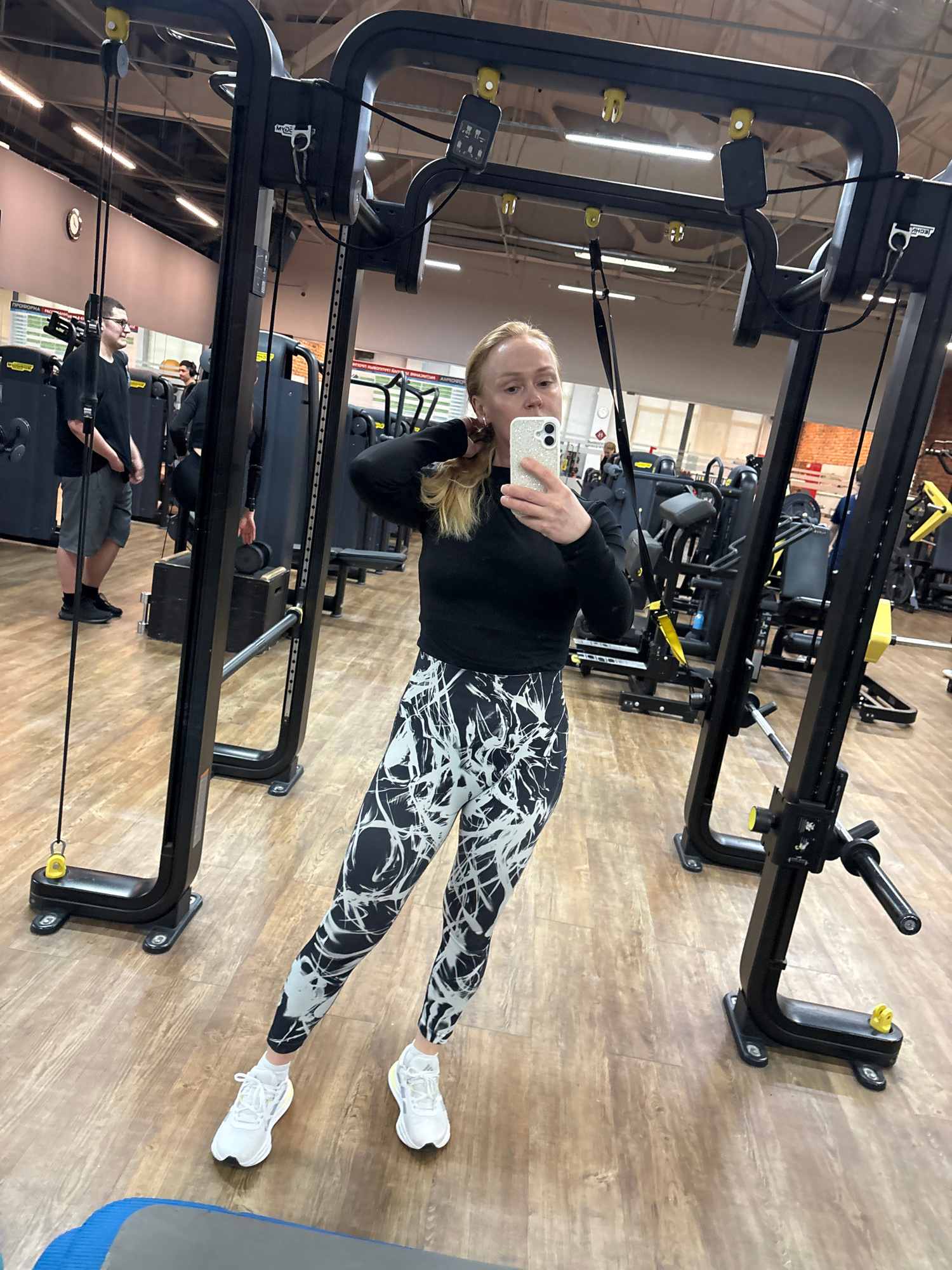 The image shows a gym interior. A woman in black and white leggings and a black shirt is taking a selfie in a mirrored exercise machine. The mirror reflects the gym environment, revealing other gym eq…read more