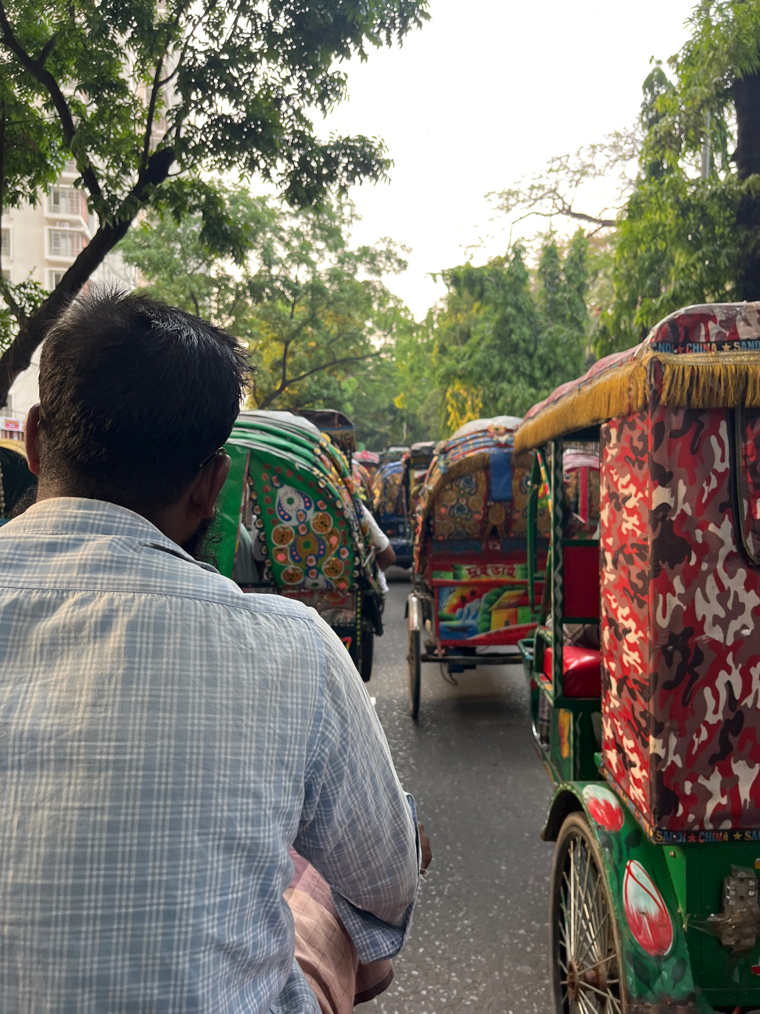 The image shows a row of cycle rickshaws on a street in Dhaka, Bangladesh. The rickshaws are colorful and decorated. A man in a light blue plaid shirt appears to be riding or standing near one of the…read more