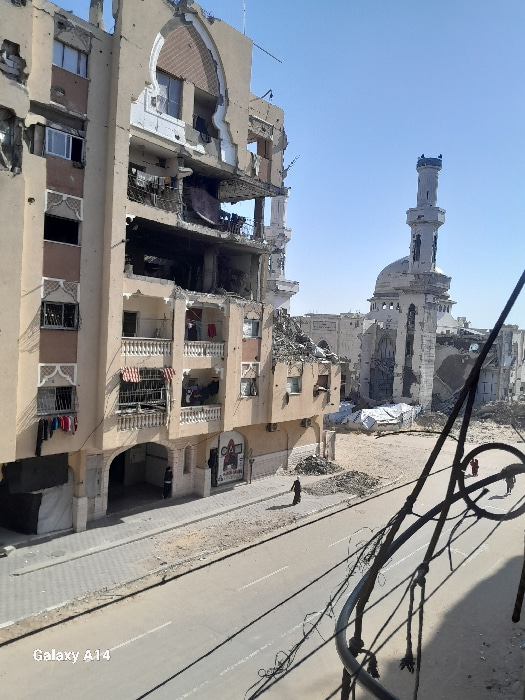 This image presents a wide-angle view of a heavily damaged urban environment in Khan Yunis, Palestinian Territory, under a clear blue sky. The foreground features a dark metal railing, casting promine…read more
