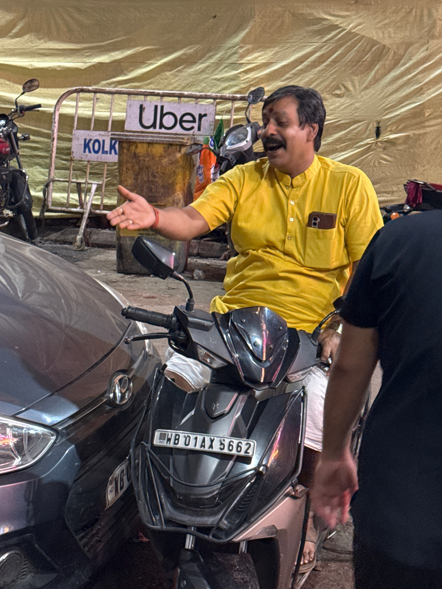 The image depicts a street scene in Kolkata, India, identifiable by the "Uber KOLK" sign, likely indicating an Uber pick-up/drop-off point. A man wearing a yellow shirt is standing on the side. A scoo…read more