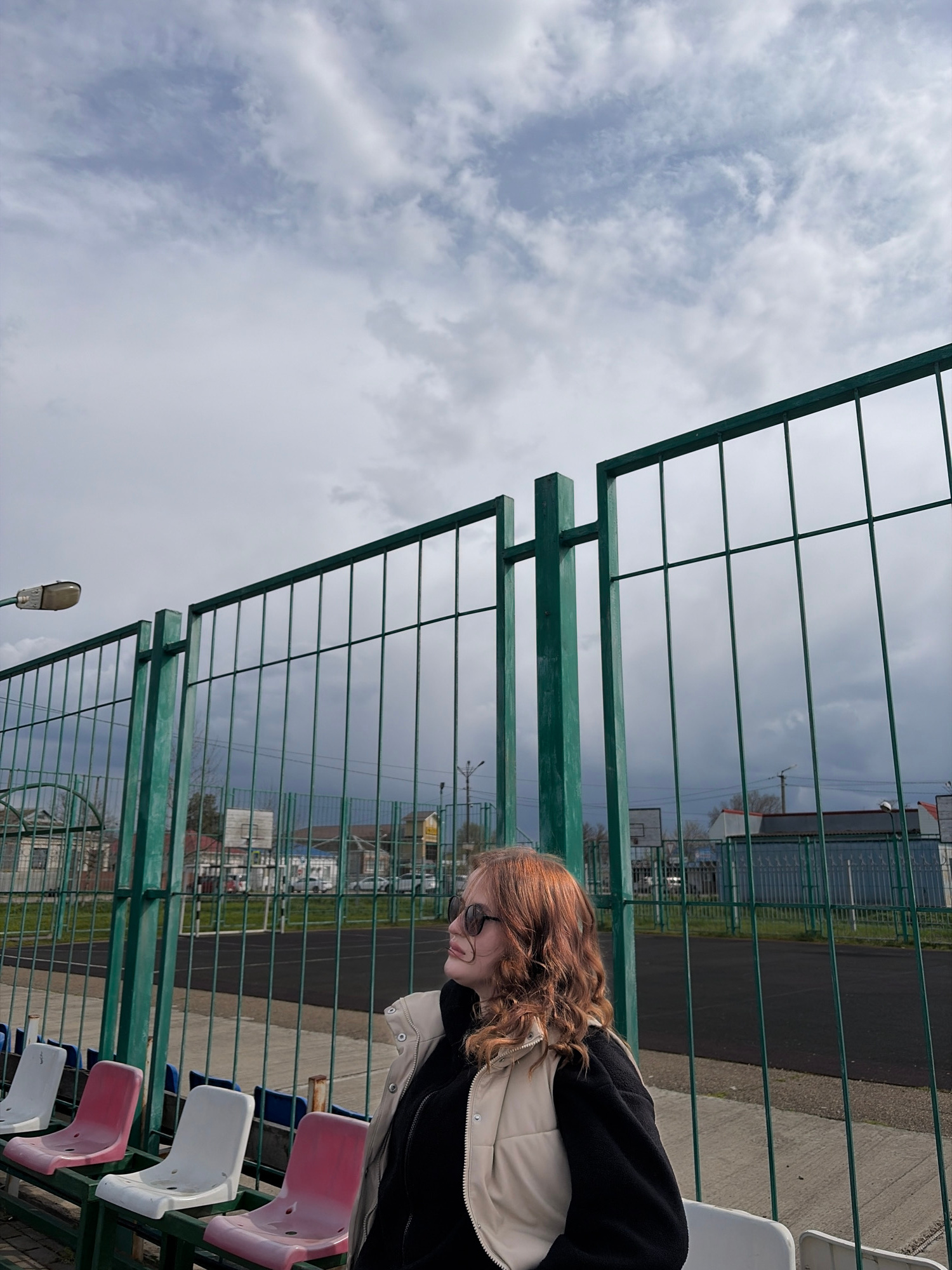 A low-angle shot shows a woman with red curly hair, wearing sunglasses, a black jacket, and a beige vest, seated in a stadium. The seating arrangement includes alternating pink, white, and blue plasti…read more