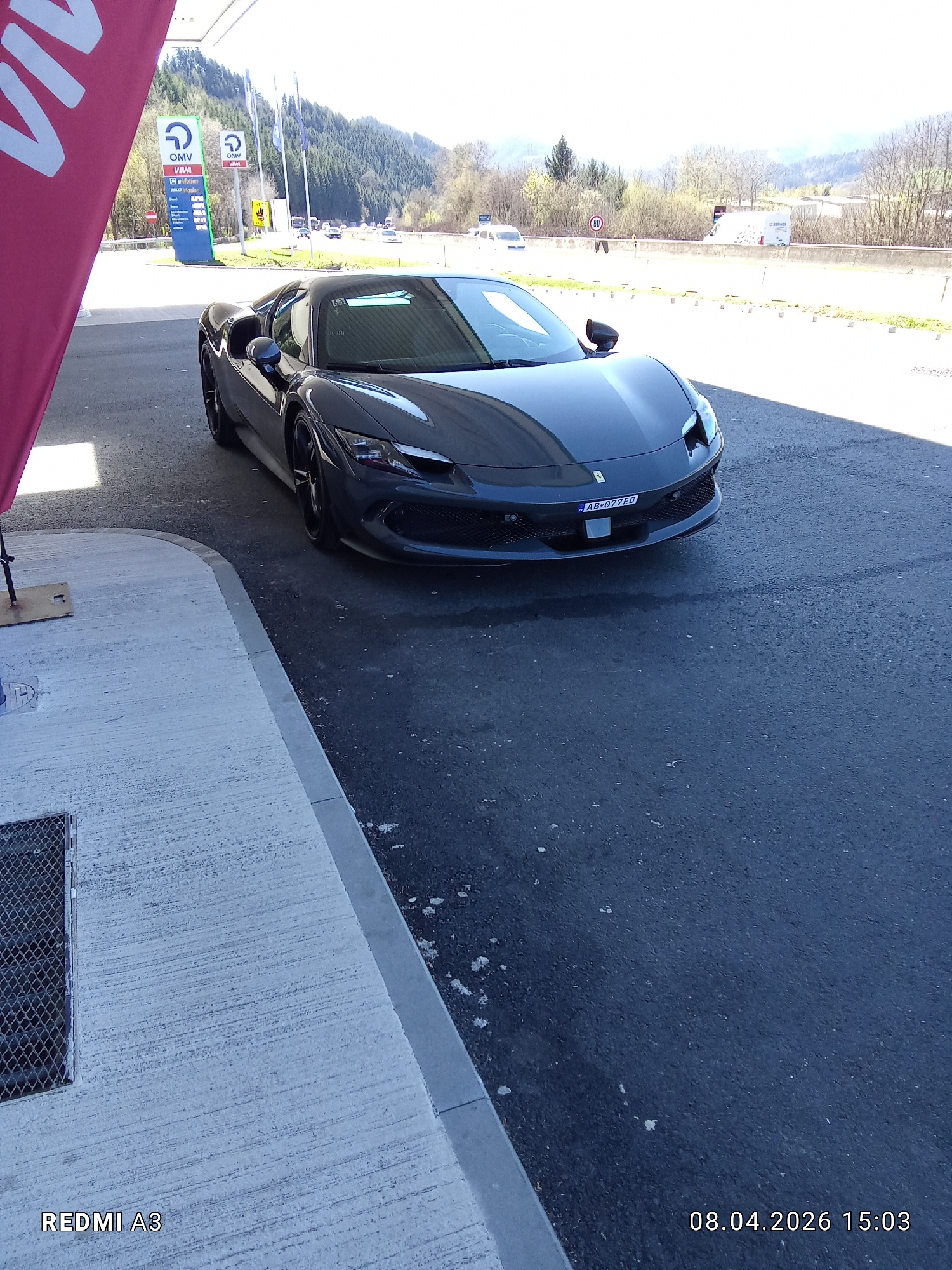 Here's a detailed description of the image: **Scene:** The image captures a dark gray Ferrari 296 GTB parked at an OMV gas station in Kapfenberg, Austria. The car is positioned near a fuel pump, whic…read more