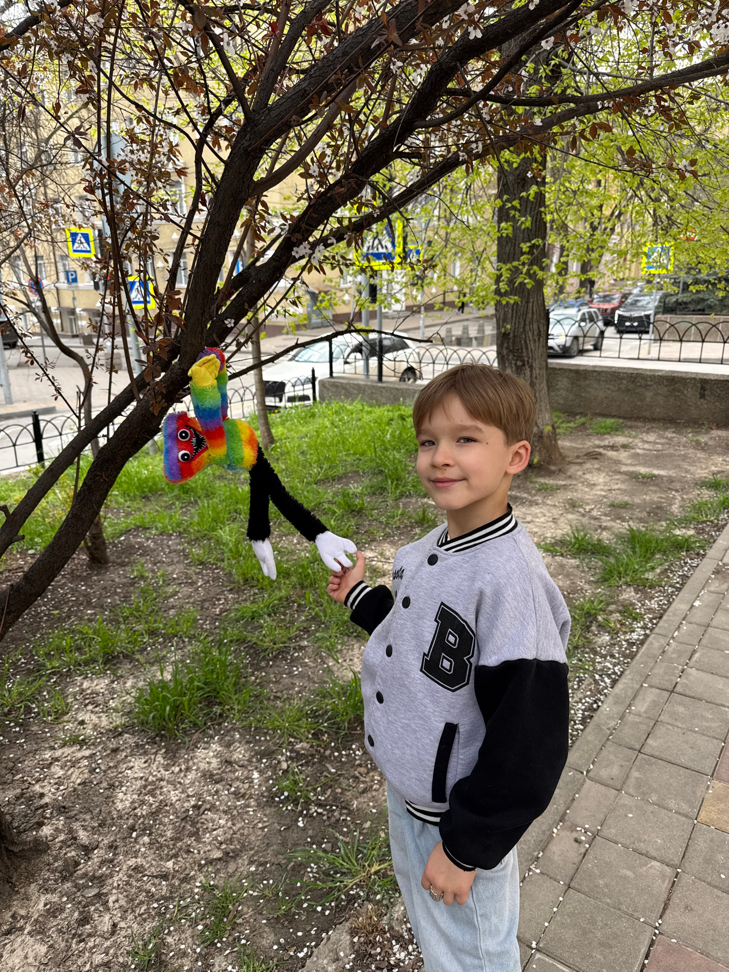 A young boy stands near a tree on a city street, possibly in Rostov-on-Don, Russia. He is wearing a grey varsity jacket with black sleeves and the letter "B," light blue jeans, and has short brown hai…read more