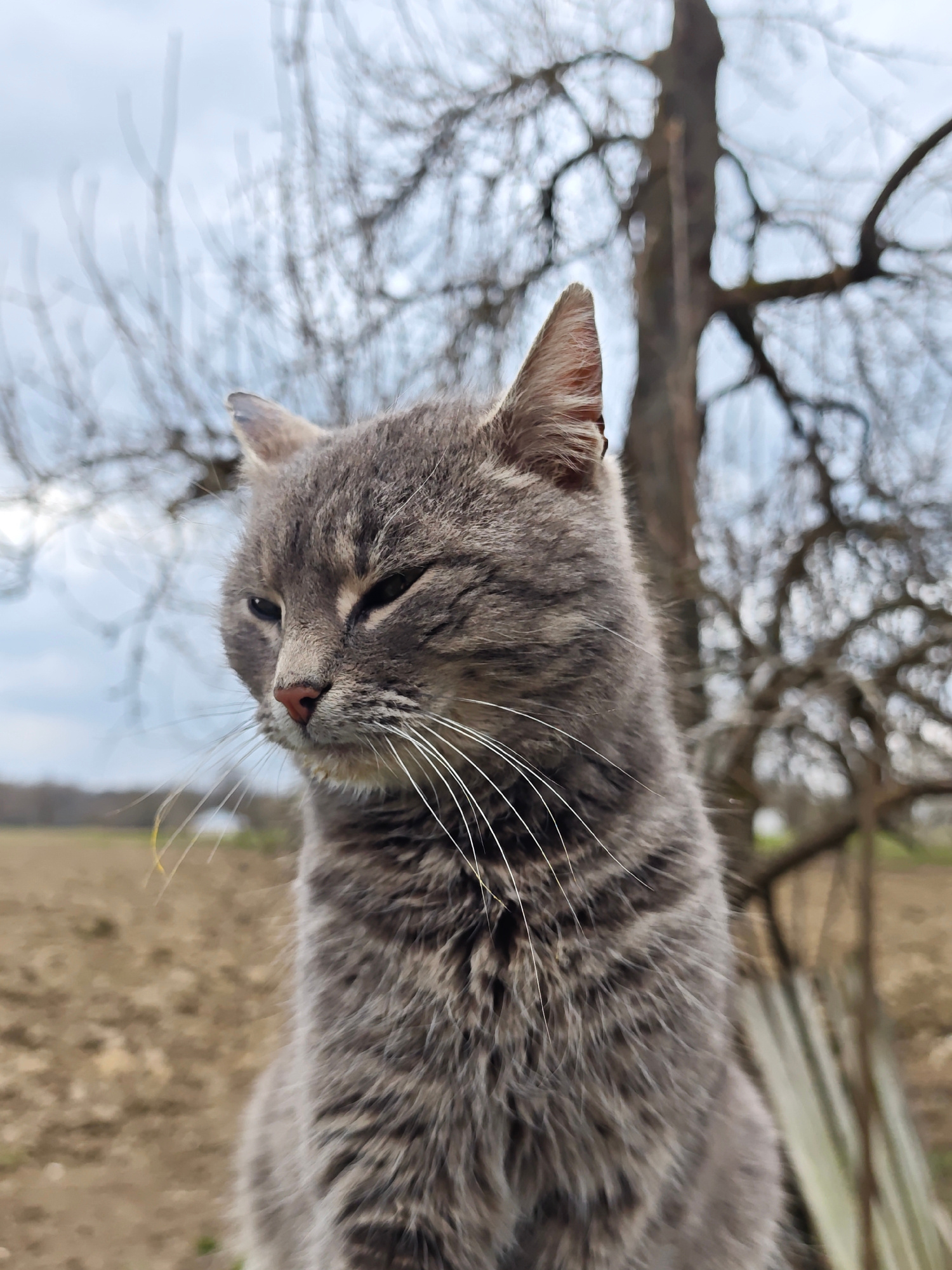 A gray tabby cat is in focus, positioned in the foreground. It has white whiskers and a pink nose. The cat is sitting with its body facing slightly to the left. Its eyes are partially closed. The bac…read more