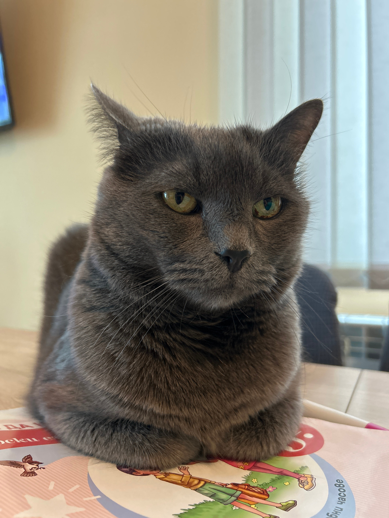 A gray cat is lying on a surface with a book or magazine. The cat's head is tilted, with green eyes looking directly at the camera. The surface features an illustration of children, text in what appea…read more