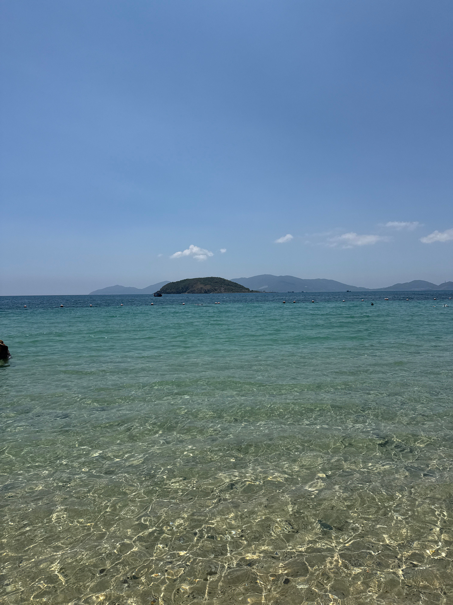 The image displays a coastal environment in Nha Trang, Vietnam, under a clear blue sky with minimal cloud cover. A range of distant mountains forms the horizon line. In the mid-distance, a prominent, verdant island is centrally situated, with a smaller landmass visible further to its right. The ocean water transitions from a deeper blue at the horizon to a clear, greenish-turquoise in the mid-ground and foreground. A horizontal line of approximately eight orange and white spherical buoys extends across the mid-ground, delineating a section of the water. A small, dark-hulled boat is visible in the water to the right of the central island. Multiple indistinct dark shapes, consistent with individuals, are present within the water, some near the buoy line. The immediate foreground reveals the seabed, composed of light-colored sand and scattered dark rocks, through exceptionally clear water, with sunlight creating rippled caustic patterns on the bottom. | Open Wire