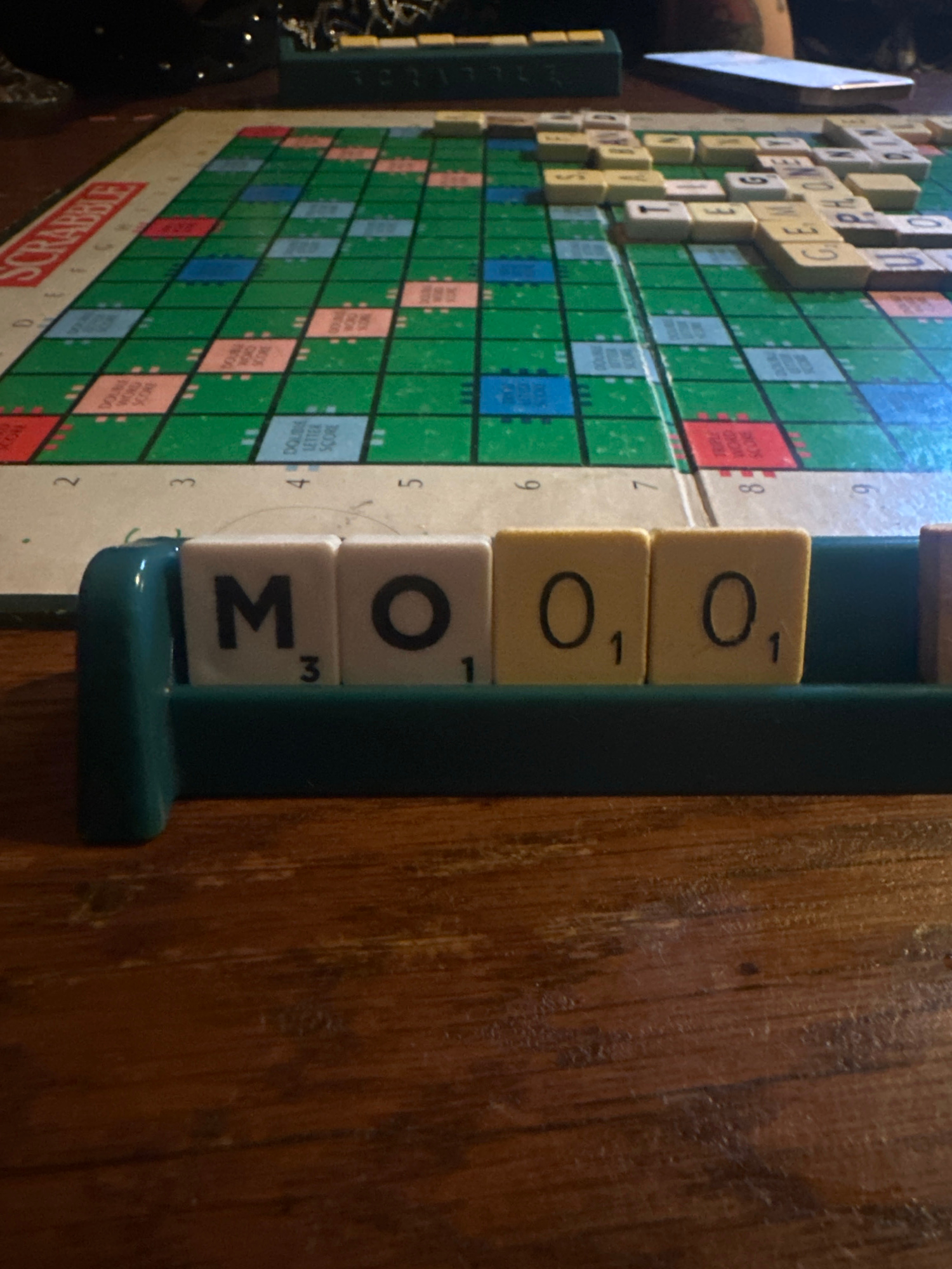 A Scrabble board game is set on a wooden surface. The tile rack shows the letters "MOM". Additional letters are placed on the board including "PHONE" and "GEM".