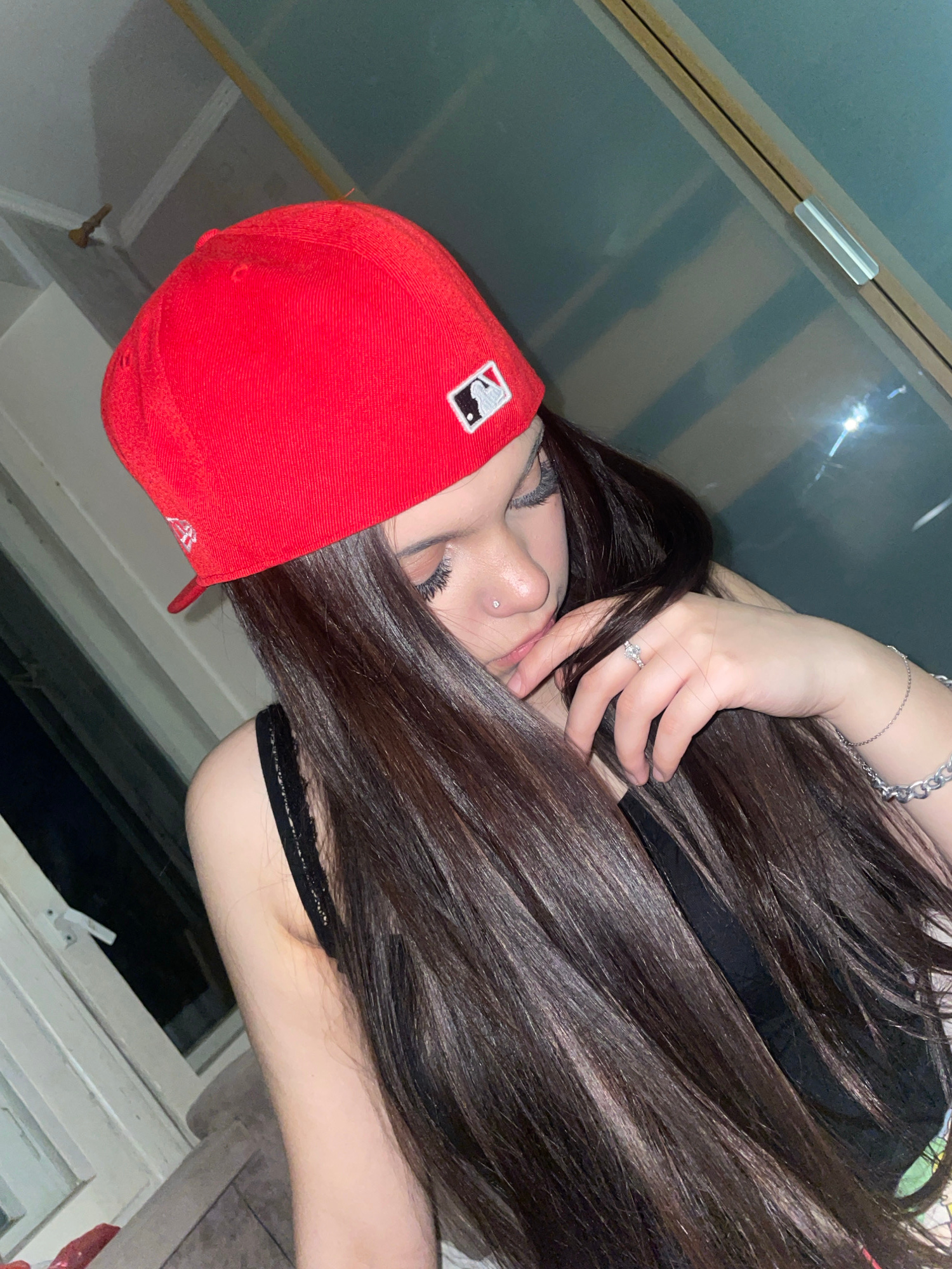 A young woman wearing a red baseball cap is depicted in a close-up shot, likely taken indoors in Murino, Russia. The cap features a white logo. Her long, dark hair is styled and falls across her body…read more