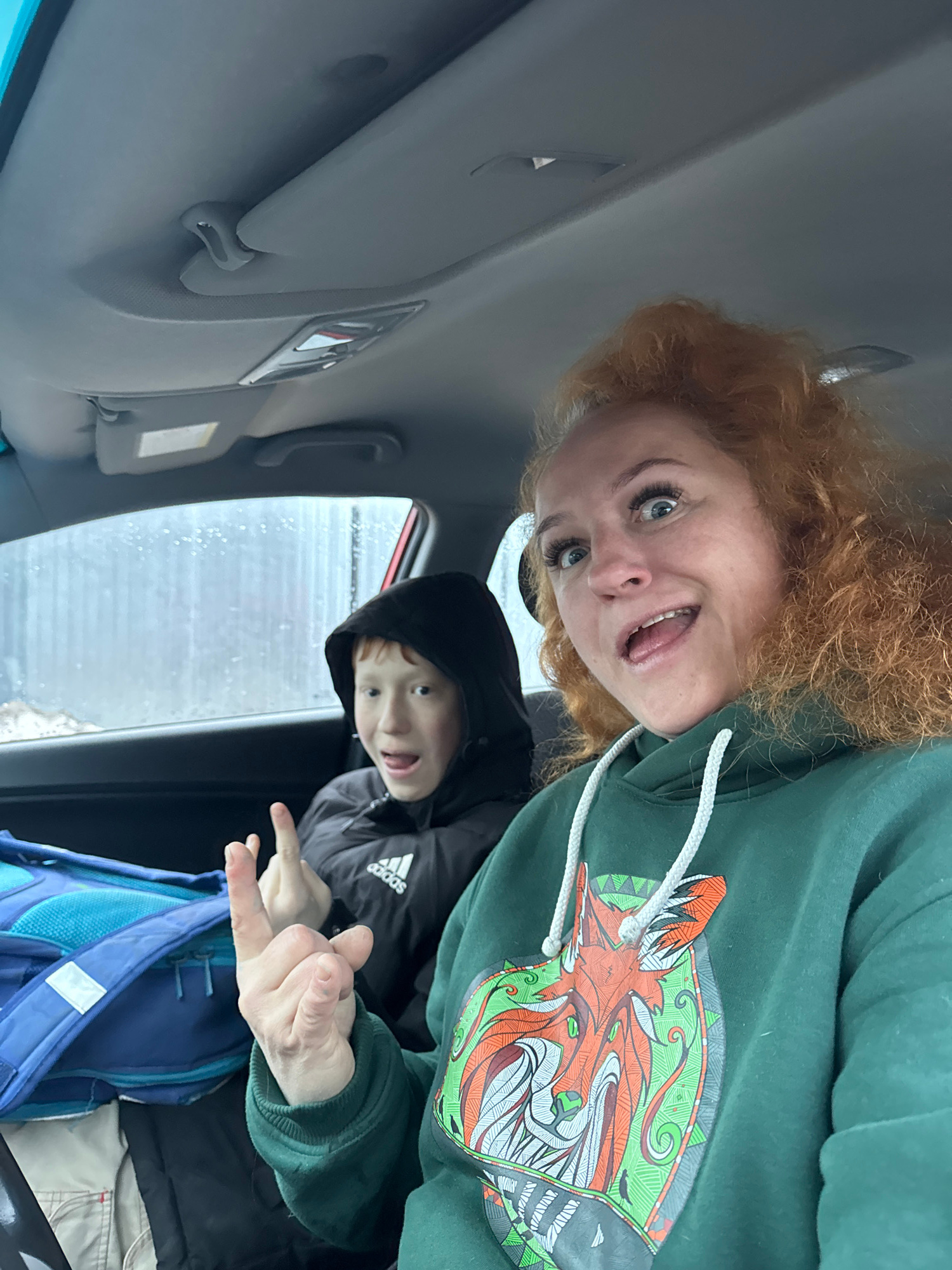 A woman and a boy are inside a vehicle, possibly a car, in Chaikovsky, Russia. The woman, with red curly hair, is wearing a green hoodie with a design of a wolf. She is looking at the camera with her…read more