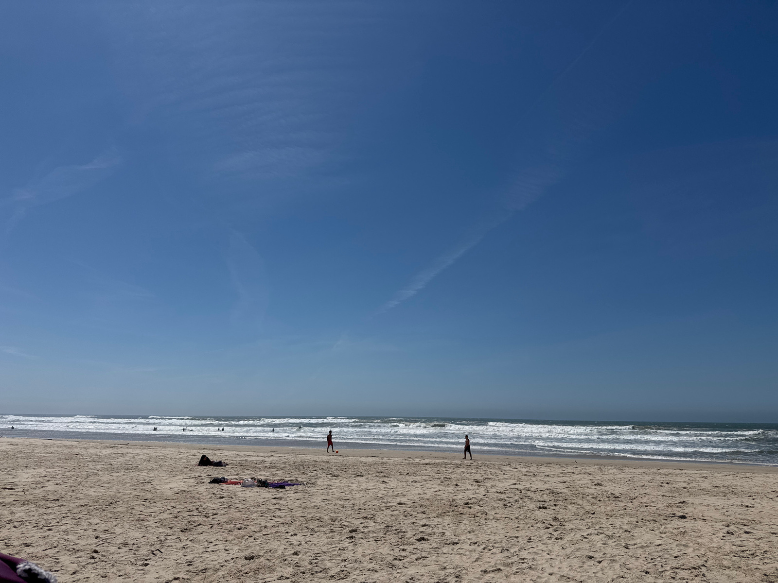 The image depicts a beach scene in Figueira da Foz, Portugal on a sunny day with a clear blue sky. The sandy beach occupies the lower half of the image, showing footprints and small objects scattered…read more