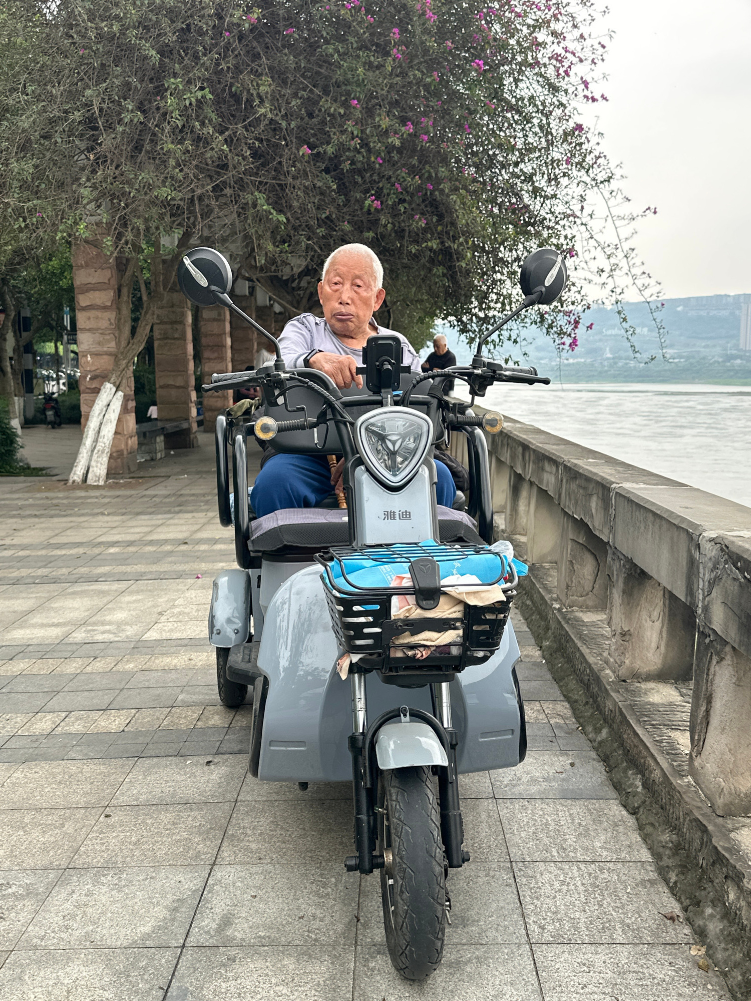 The image shows an elderly man sitting on a gray electric scooter parked on a paved sidewalk next to a low concrete wall. A bush with purple flowers is visible behind him to the left. The background s…read more