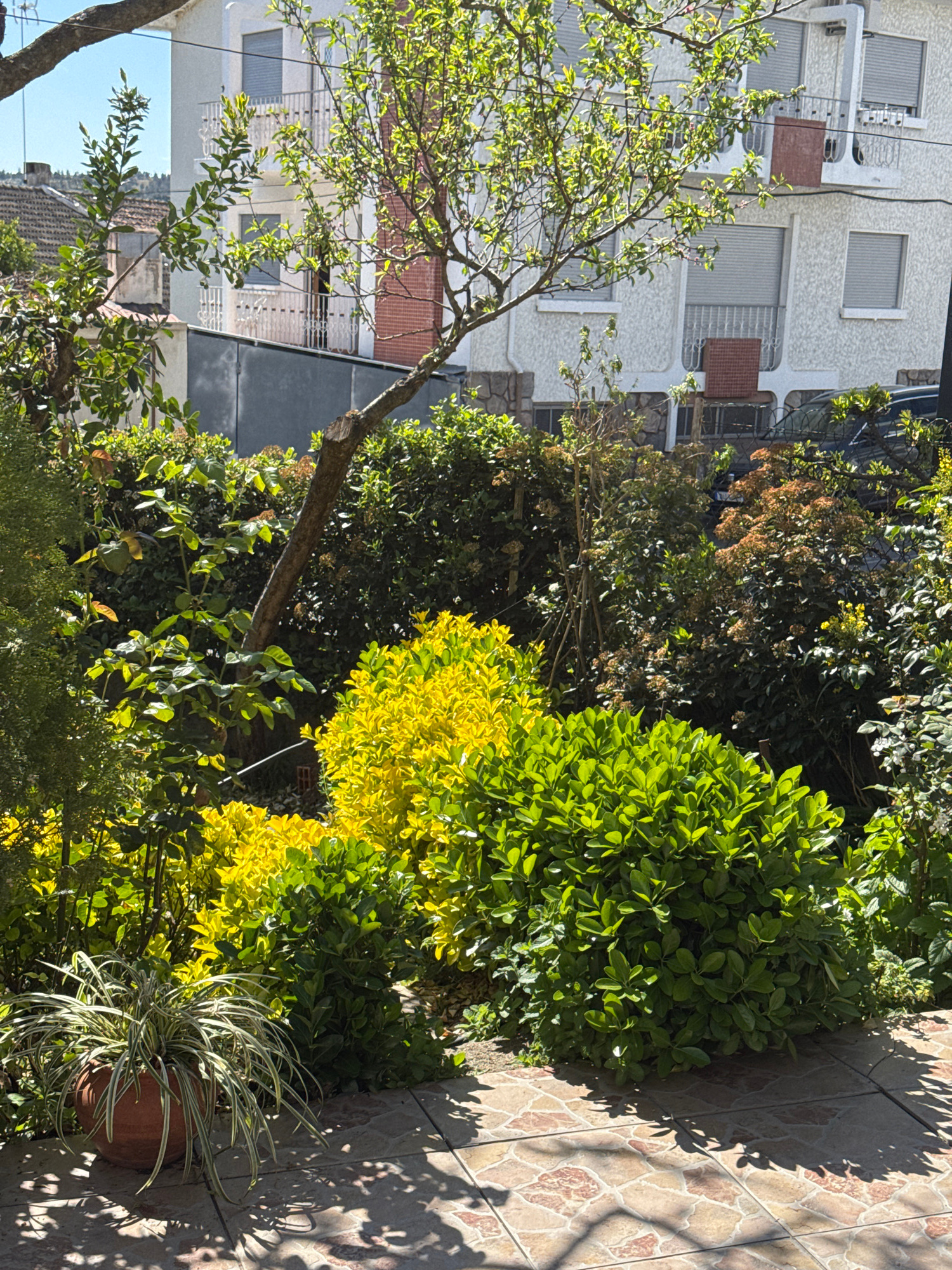 The scene depicts a sunlit residential garden in Mirandela, Portugal, viewed towards a multi-story building. The foreground features a tiled patio composed of light-colored, patterned square tiles, ma…read more