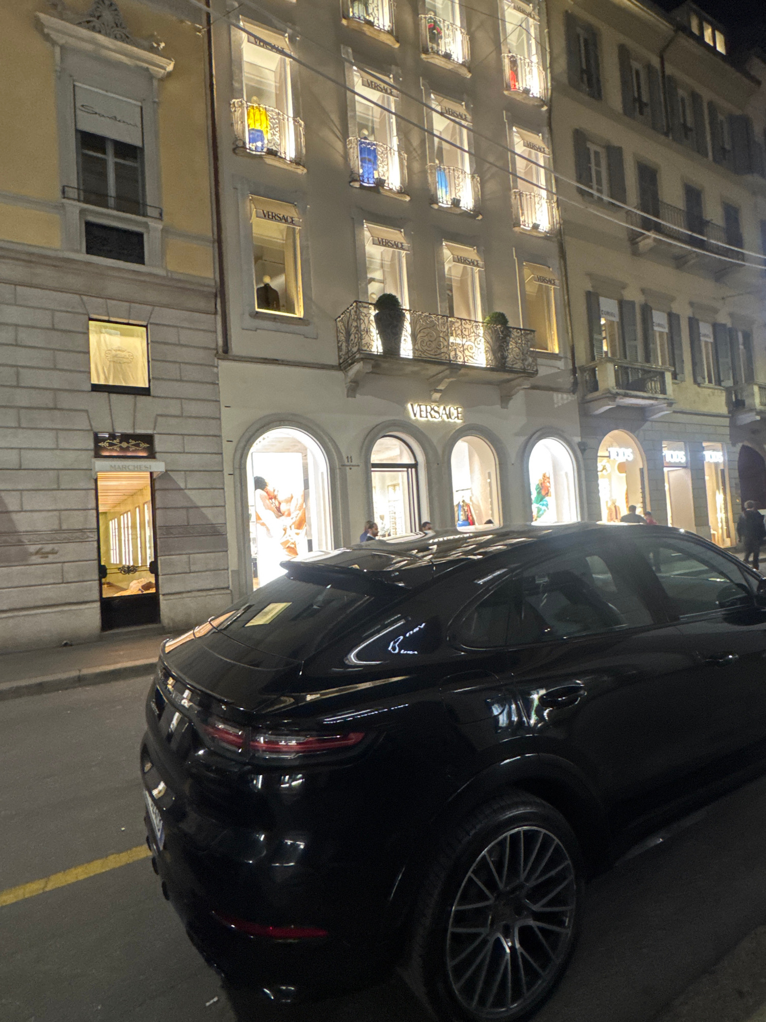 The image presents a street scene in Milan, Italy, at night. A black car, likely a luxury vehicle based on the visible wheel design, is parked on the right side of the frame. The background showcases an upscale building with several floors, adorned with Versace signage on the windows and above the storefront. The storefronts include names like Versace, Tod's, and Marchesi. The building appears to be located in a high-end shopping district, as evidenced by the presence of luxury brand stores. There is light emanating from the building's windows and storefronts, illuminating the street scene. Some people are visible within the store interiors. | Open Wire