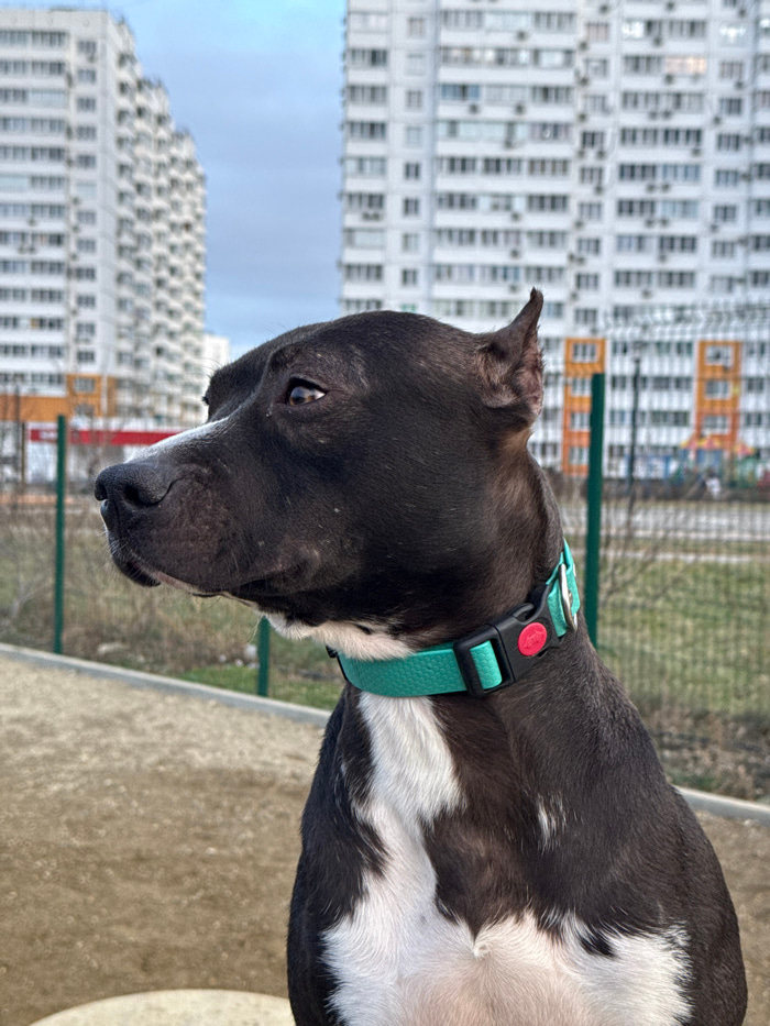 A black and white pitbull-type dog with a turquoise collar stands in a park. The dog is looking up and to the right. In the background are tall apartment buildings with many windows. The sky is overca…read more