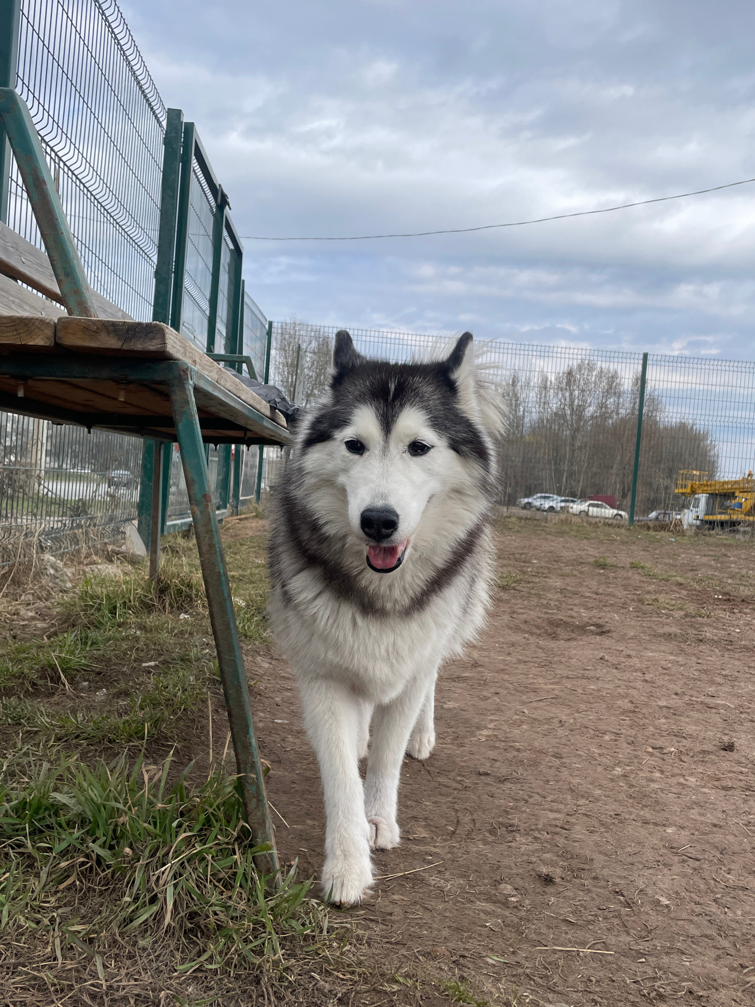 The image prominently features a large, fluffy dog, resembling a Siberian Husky or Alaskan Malamute, with striking black, white, and grey fur. The dog is positioned in the foreground, facing directly…read more