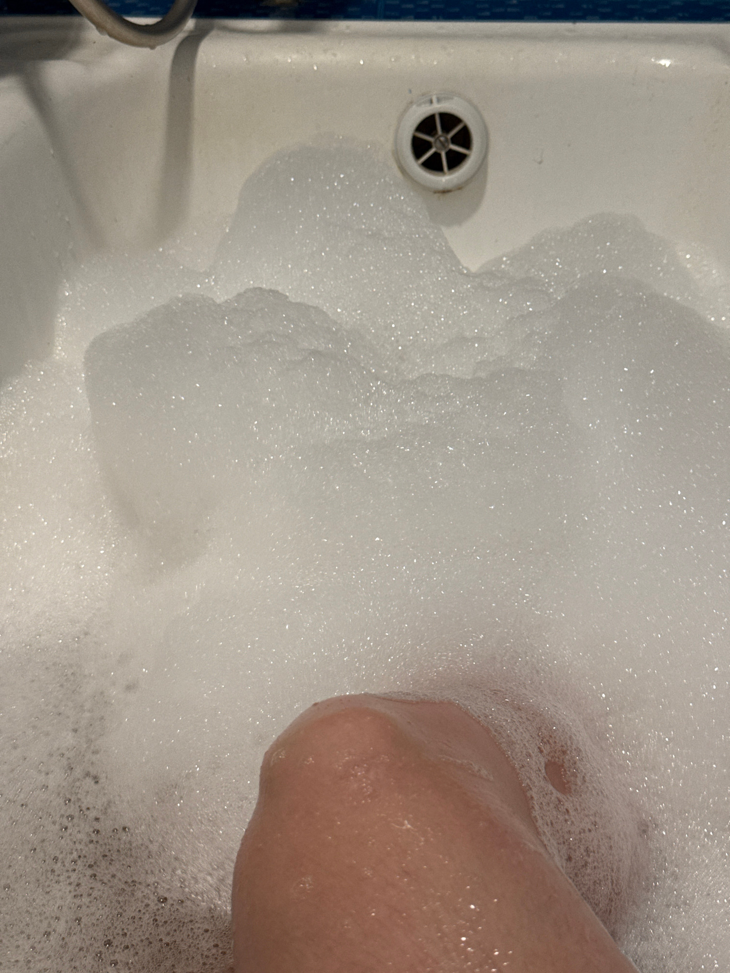 The image shows a white bathtub filled with white bubbles, with the drain visible on the left side. A person's leg is partially visible on the right side of the frame, submerged in the bubbles. The ph…read more