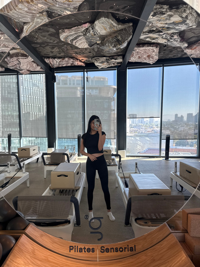 A woman in black athletic wear poses for a selfie in a bright, modern pilates studio. Pilates machines are positioned in rows. Large windows with partially drawn blinds offer a city view. The studio f…read more