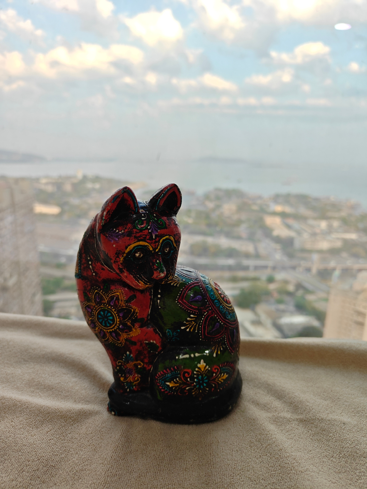 A colorful, painted cat figurine sits on a beige surface with a blurred cityscape in the background. The cat is predominantly red and green, adorned with intricate floral patterns in various colors. Tβ¦read more