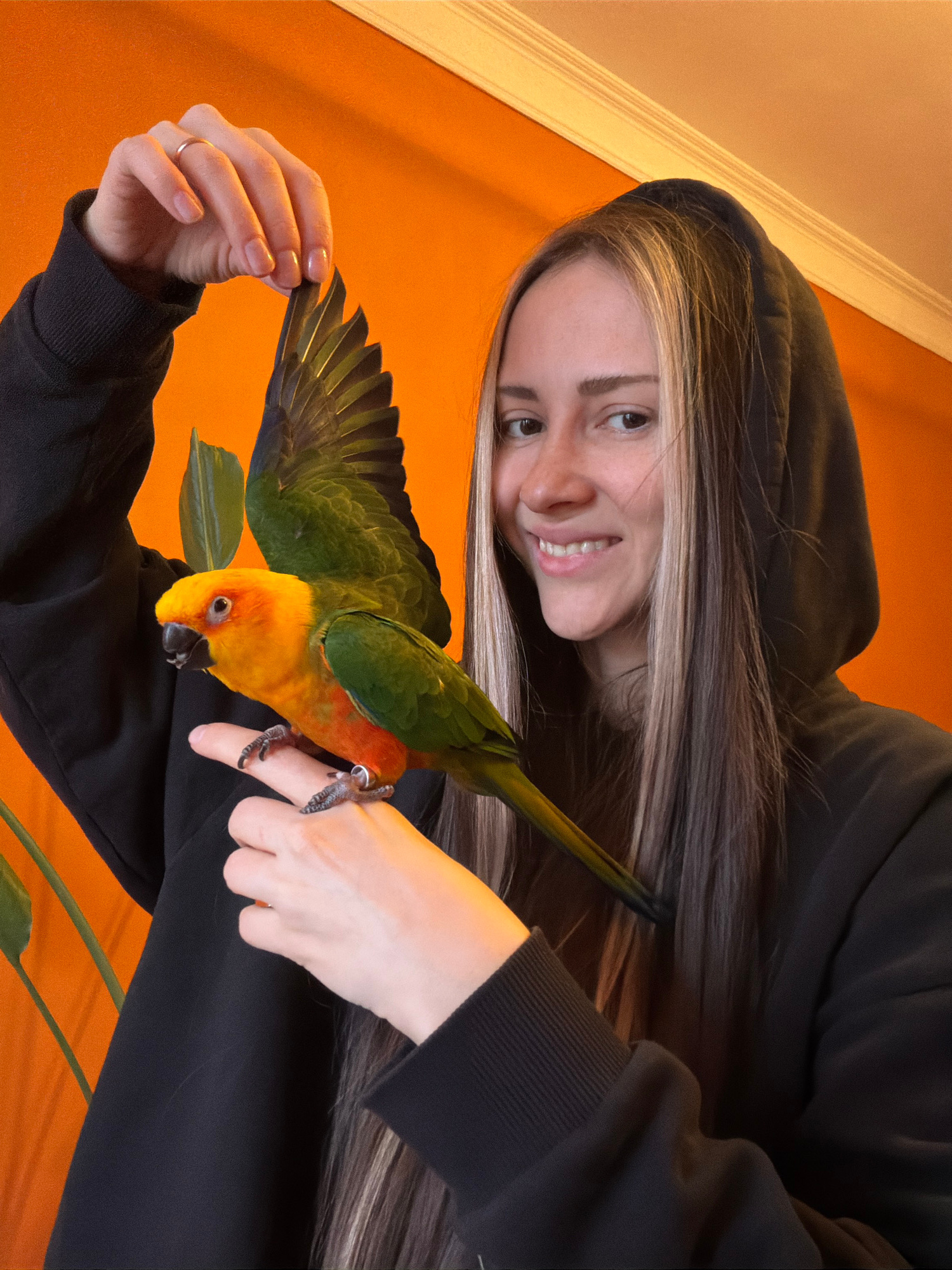 A young woman with light skin, long brown hair with blonde highlights, and wearing a black hooded sweatshirt is smiling and looking down at a Sun Conure parrot. The parrot is perched on her hand and e…read more