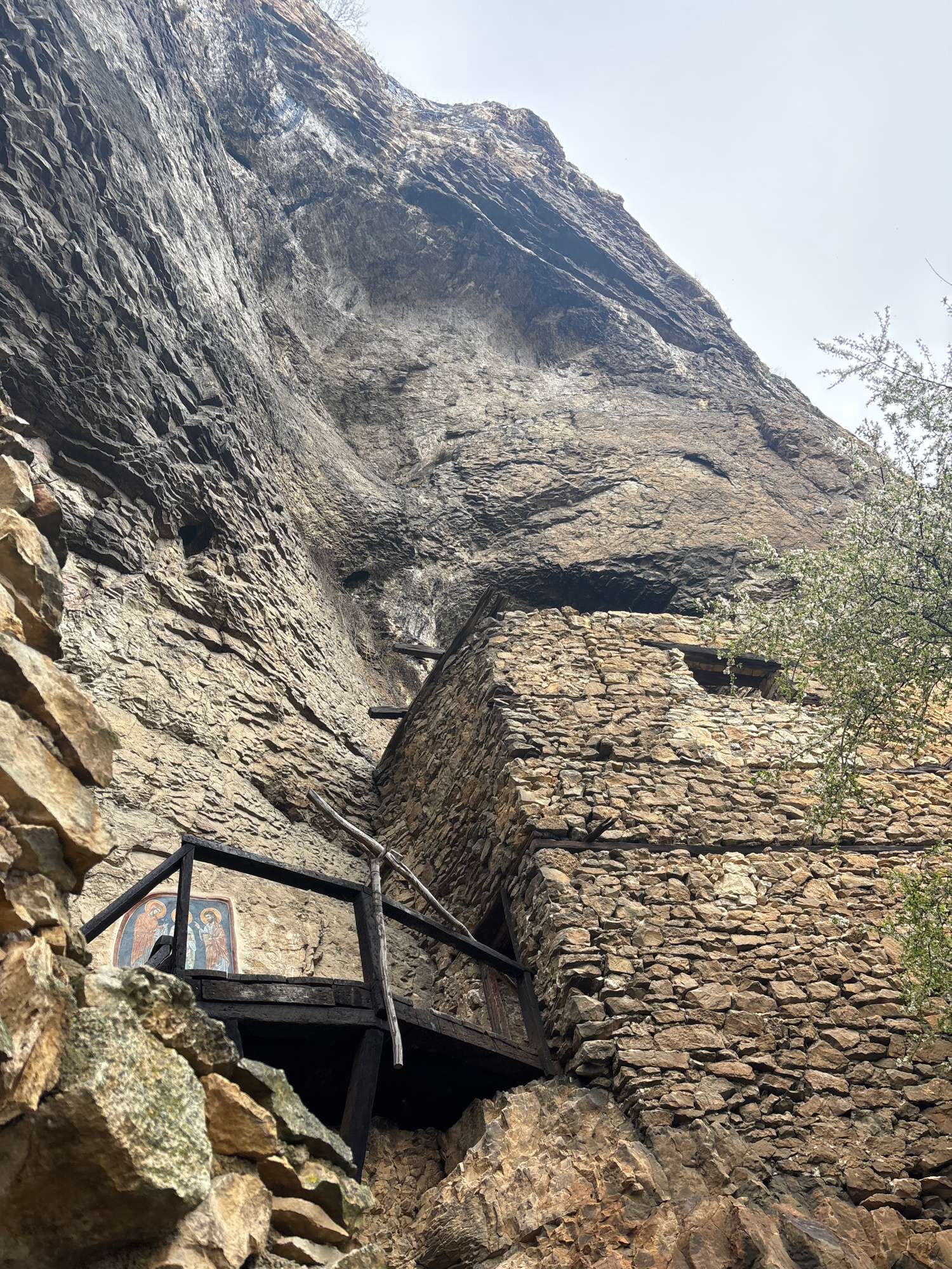 The image depicts a historical site, specifically the St. Mary's Cave Monastery, also known as "Gluhite Kamani" or "Deaf Stones," located near the city of Karlukovo in Bulgaria. The scene shows a rock…read more