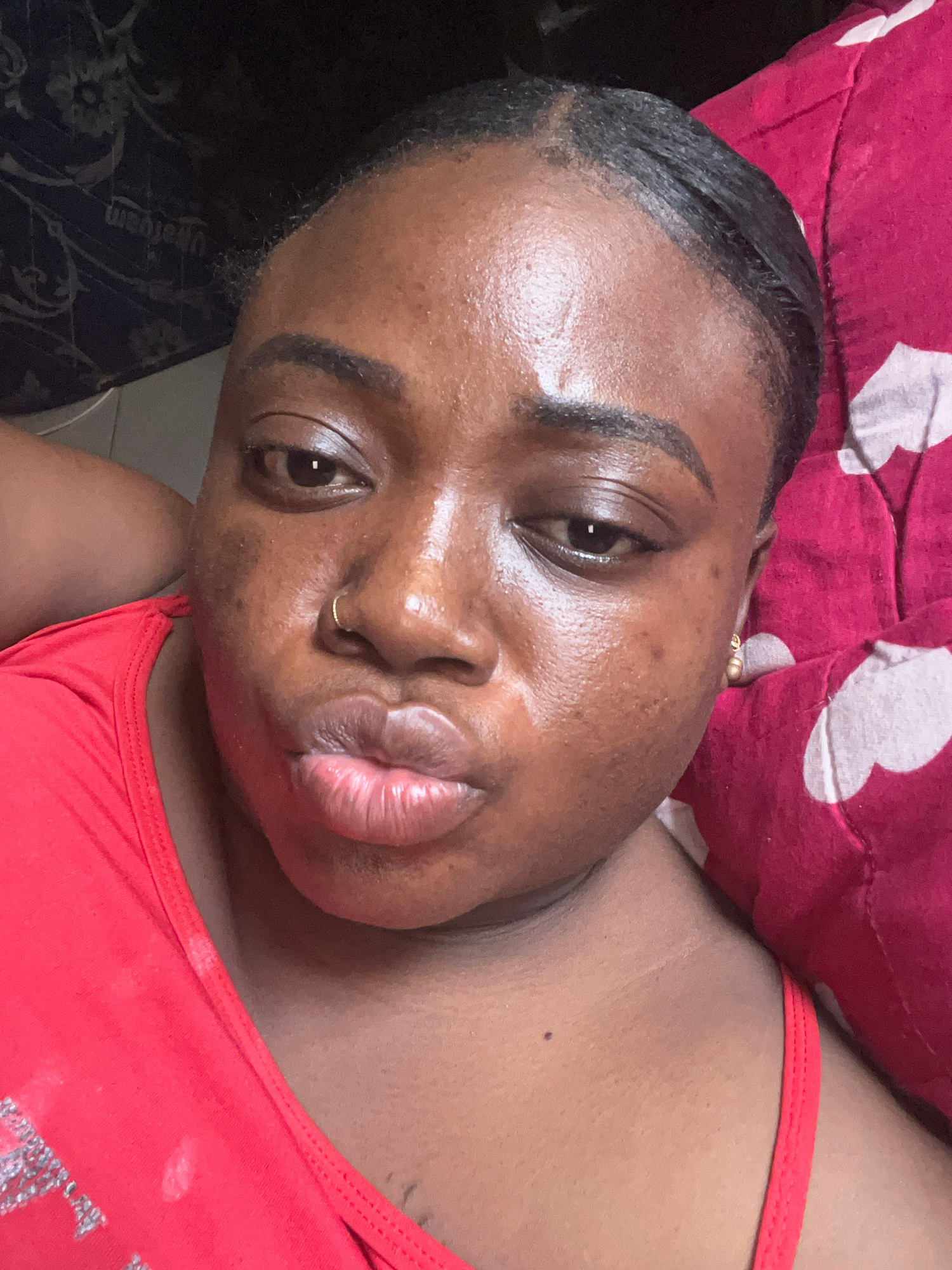 A medium-shot, high-angle selfie taken indoors shows a Black woman with dark skin, prominent cheekbones, and full lips. She has dark, styled hair slicked back and wears a small, gold nose ring. Her ex…read more