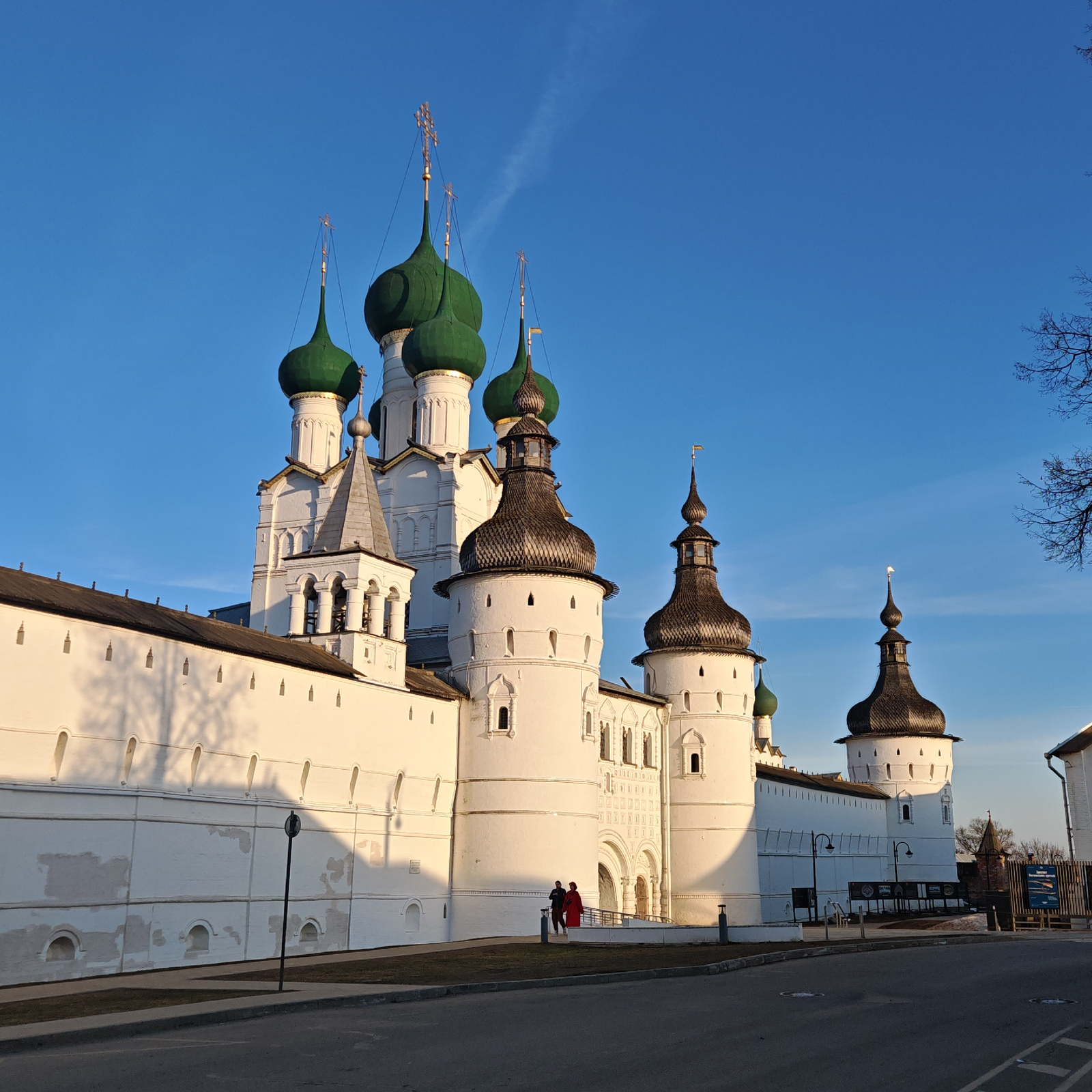 The image shows the Rostov Kremlin, located in Rostov, Russia. The complex is composed of white stone buildings, including tall walls with turrets, cathedrals with green domes, and a bell tower. The s…read more