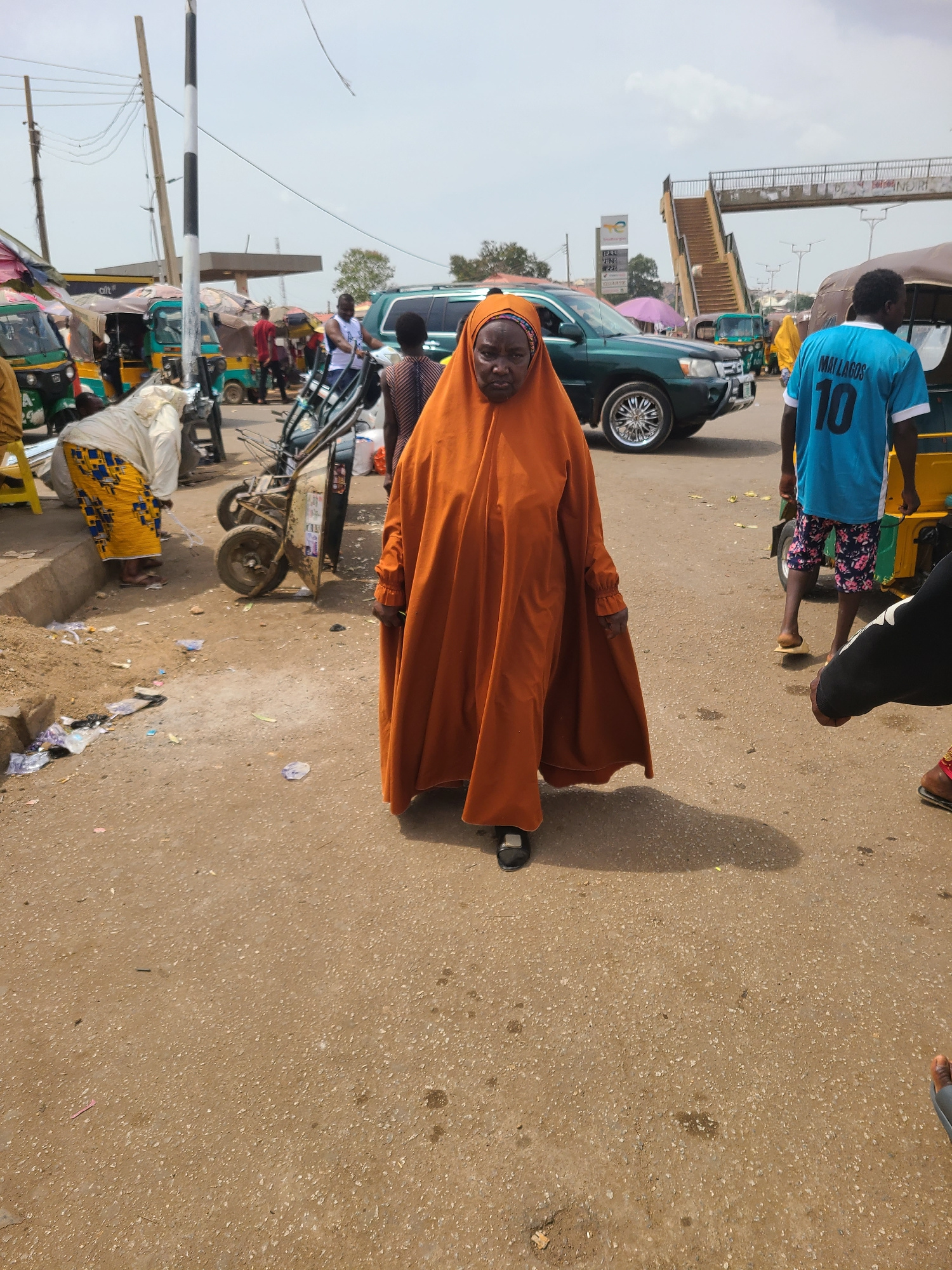 A street in Jos, Nigeria is depicted in this medium shot. A woman wearing a burnt orange hijab is walking toward the left side of the frame. Behind her, various individuals are present; one is wearing…read more