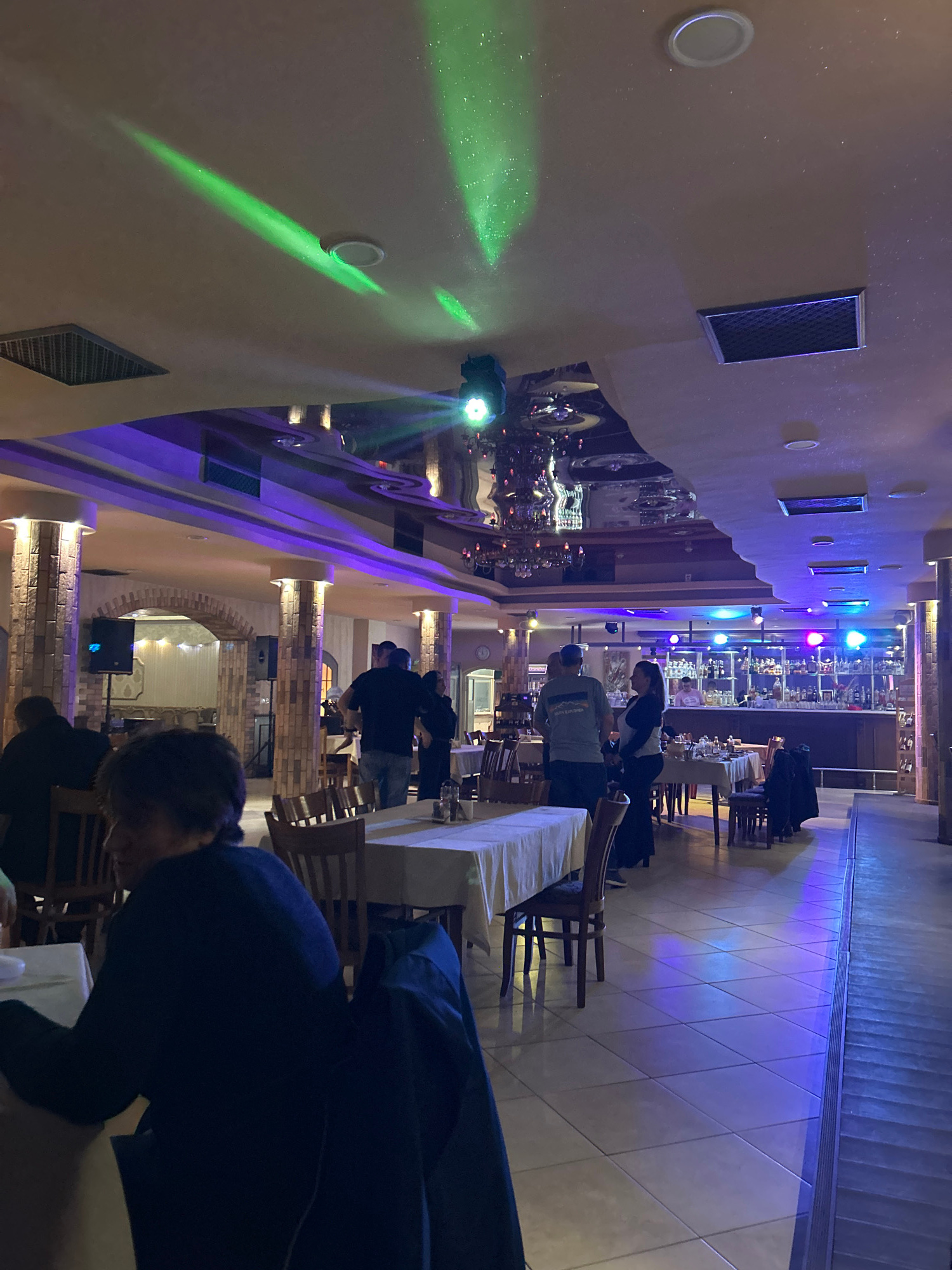 The image shows the interior of a restaurant in Zlatograd, Bulgaria. The restaurant is decorated with stone arches and columns, with a mirrored ceiling. People are at tables, and there is a bar area in the back. Green and purple lights illuminate the space. | Open Wire