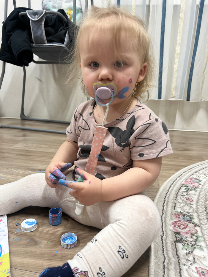 A young child with blonde hair, wearing a bunny-print shirt and white leggings with paw prints, sits on a wooden floor. The child has blue paint smeared on their face and hands, with several open pain…read more