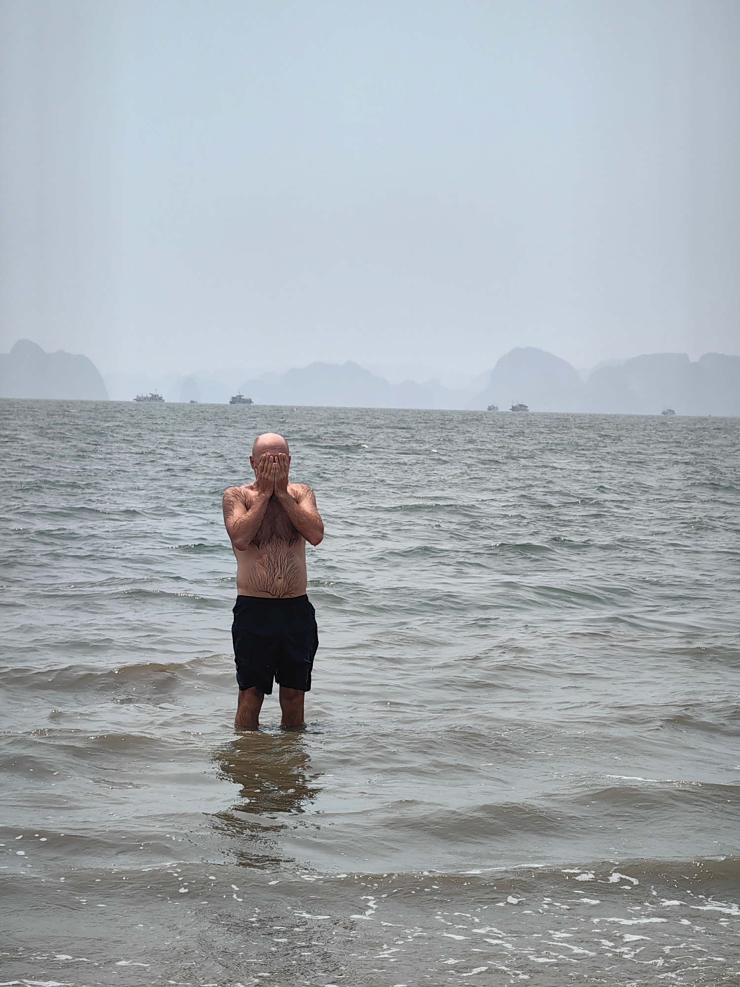 A bald man in black shorts stands waist-deep in the water of Bai Chay Ward, Vietnam. He is facing the camera with both hands covering his face. In the background, a grey, hazy seascape shows several b…read more