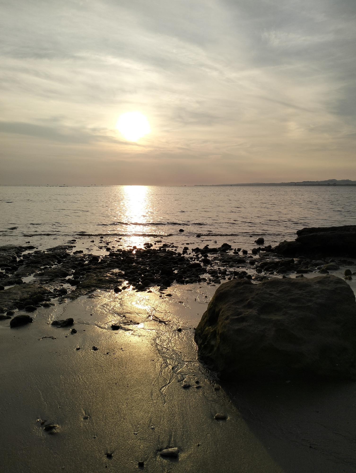 The image shows a beach at sunset, likely in Lhokmanee, Indonesia. The sun is positioned above the horizon, reflecting brightly on the water's surface, creating a glare. The foreground consists of a sā¦read more