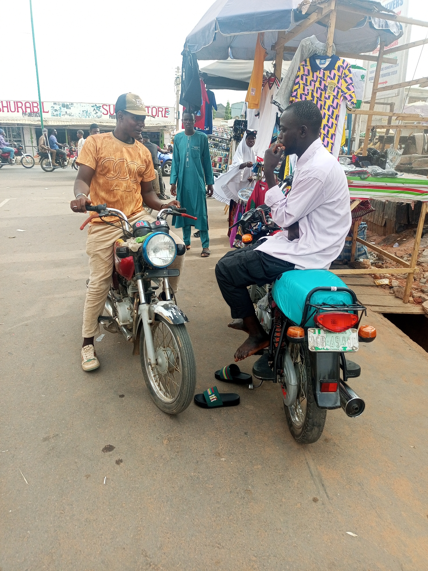 This outdoor image captures a lively street scene in Tempure, Nigeria, likely during daylight hours. The setting appears to be a marketplace or commercial area, with various shops and stalls. In the…read more