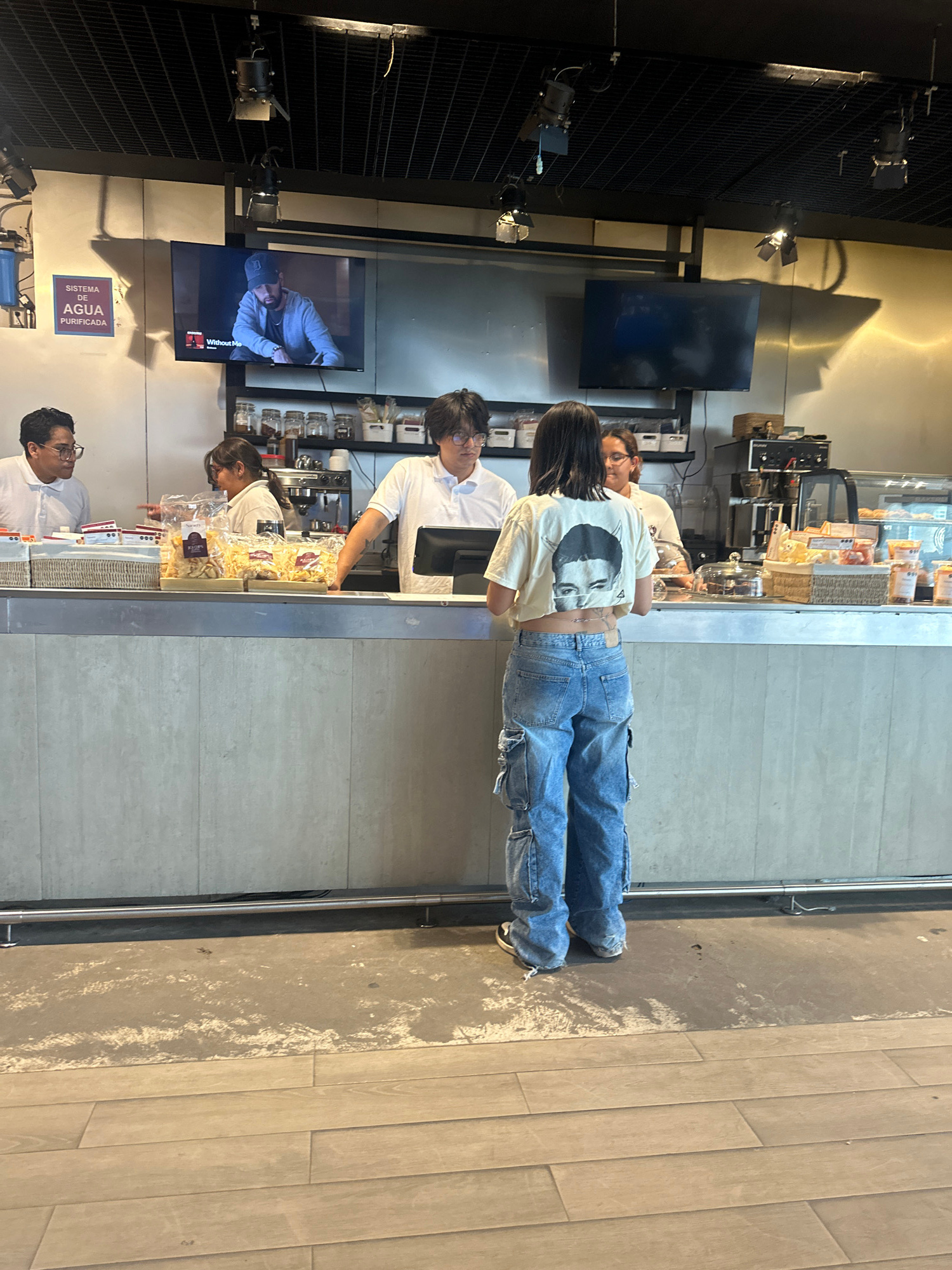 The image shows an indoor scene, likely a cafeteria or deli in Mexico City, Mexico. Several individuals are present, seemingly interacting at a counter displaying packaged goods. A person in a t-shir…read more