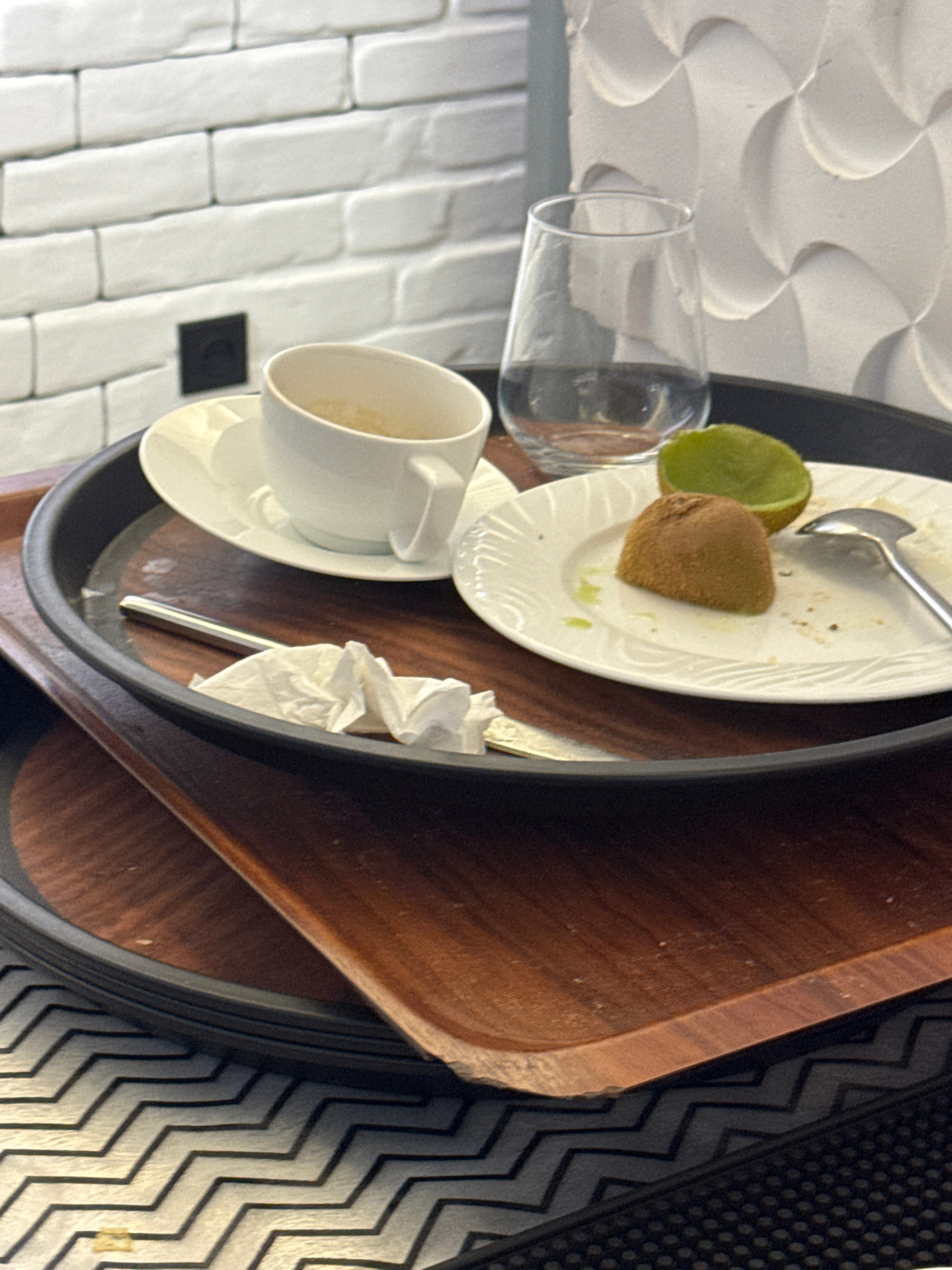 The image depicts a dirty tray with remnants of a meal. On the tray is a dirty plate with a piece of kiwi and a lime wedge. There is a spoon on the plate. A used coffee cup and saucer sit next to theβ¦read more