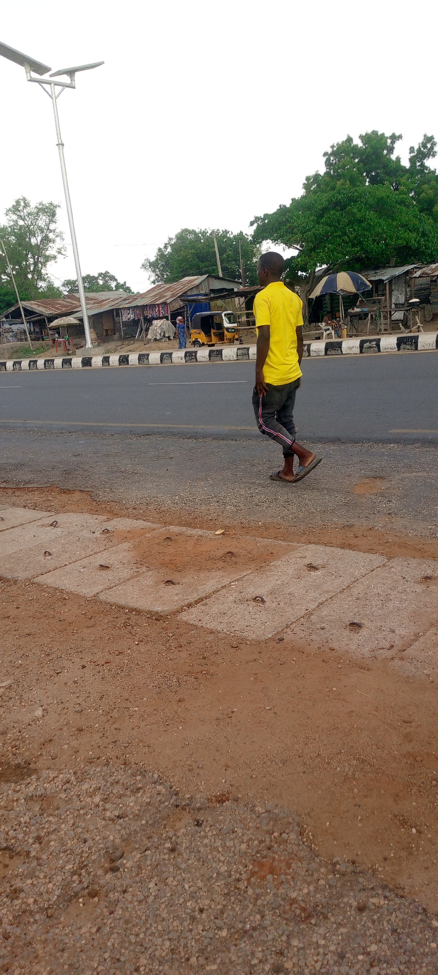 The image depicts a road scene in Zango-ndaji, Nigeria. A man wearing a yellow t-shirt and dark pants with a pink stripe is walking on the side of the road. A yellow tricycle is visible on the other s…read more