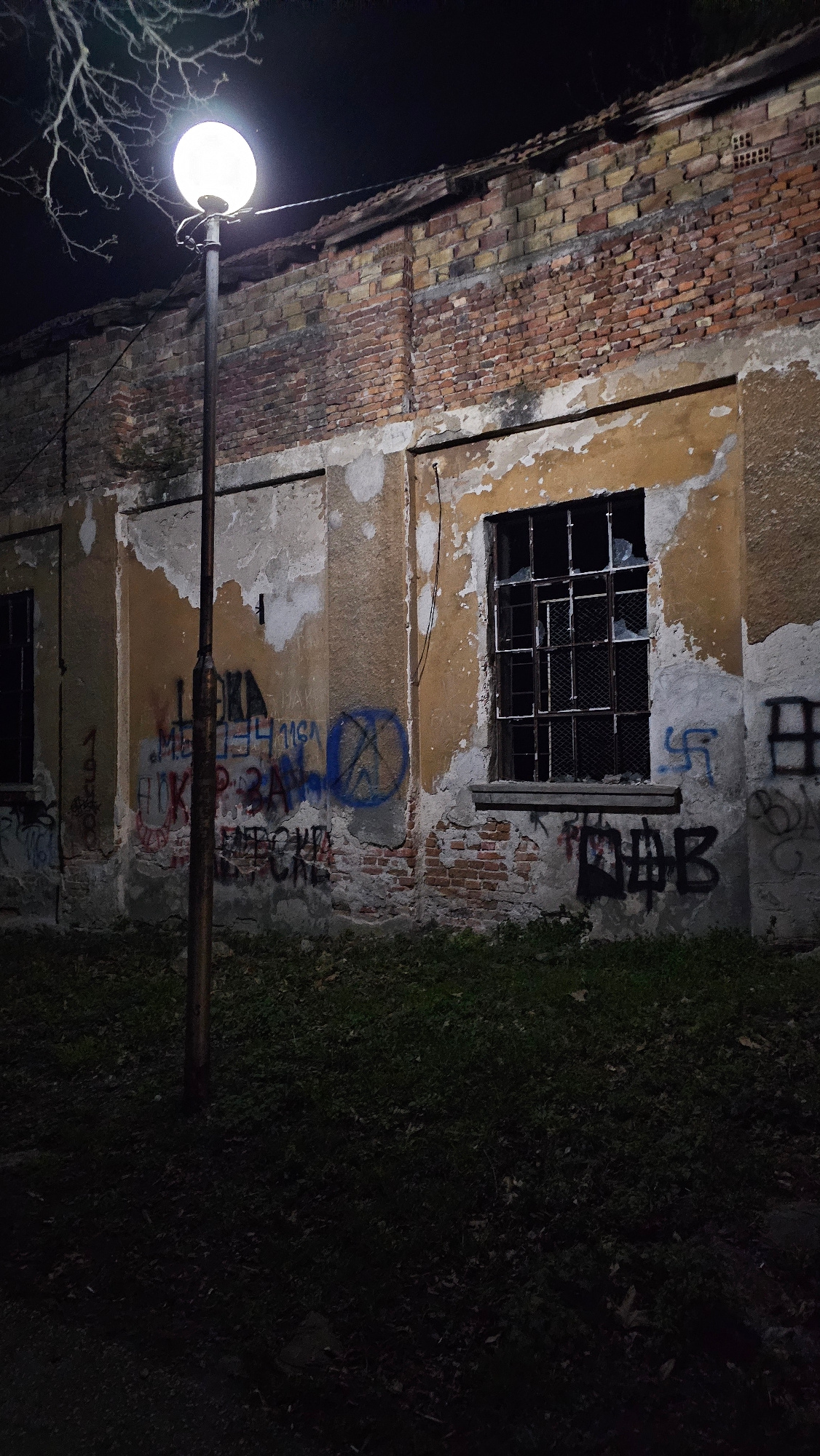 The image shows a dilapidated brick building at night. The building is covered in graffiti, and the windows are broken and barred. A street light illuminates the scene. The building's location is Karl…read more