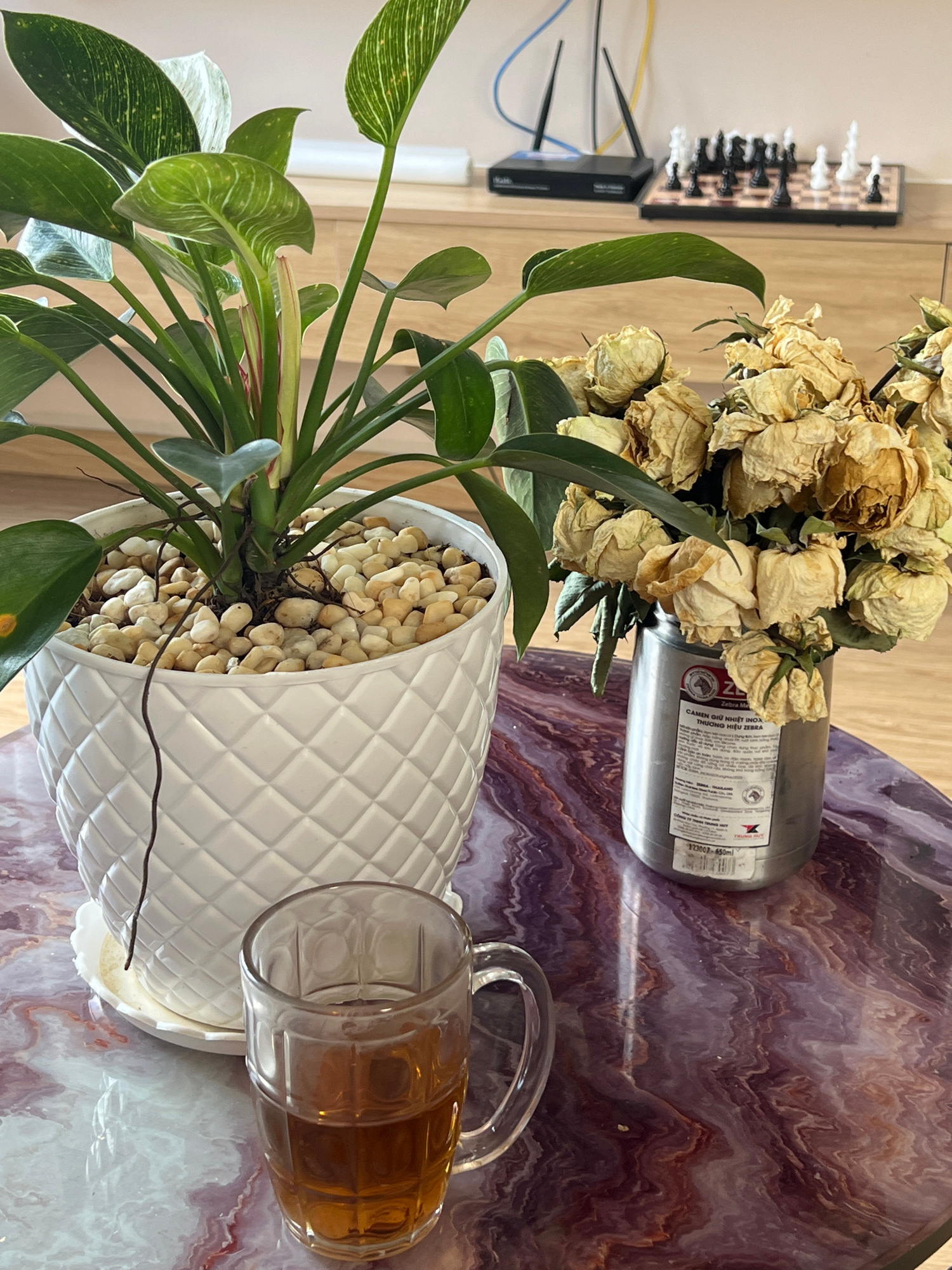 A high-angle shot captures a still life on a mottled purple and white surface, possibly a table. A white, diamond-patterned pot filled with light-colored pebbles and a green plant occupies the lower l…read more