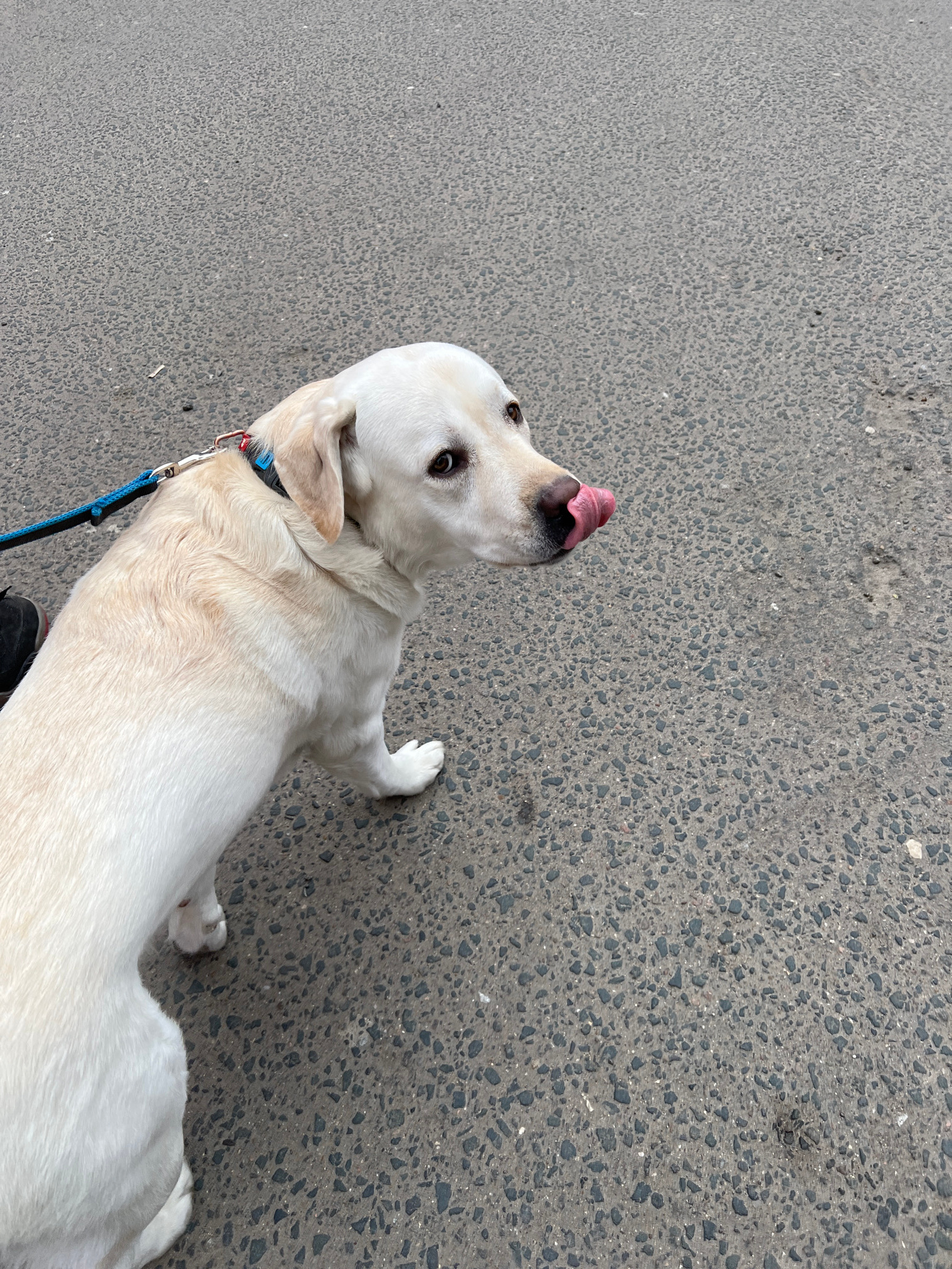 A cream-colored Labrador Retriever with a blue collar and leash is standing on asphalt. The dog is looking up and sticking its tongue out. A foot wearing a black shoe is visible near the bottom of the…read more
