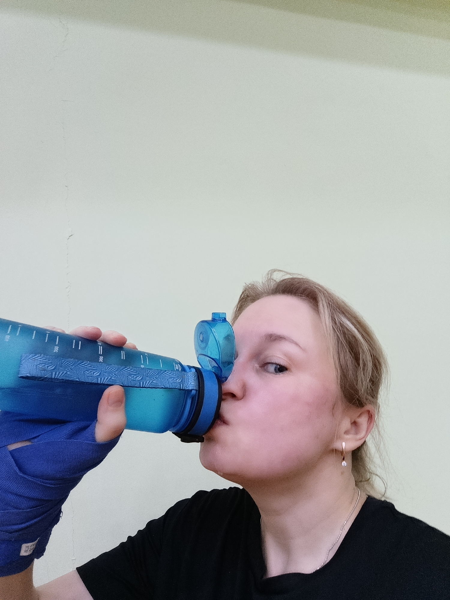 A medium shot captures a fair-skinned woman drinking from a blue water bottle. She wears a black t-shirt and has blond hair. Her left hand is wrapped in a blue bandage. A silver necklace adorns her ne…read more