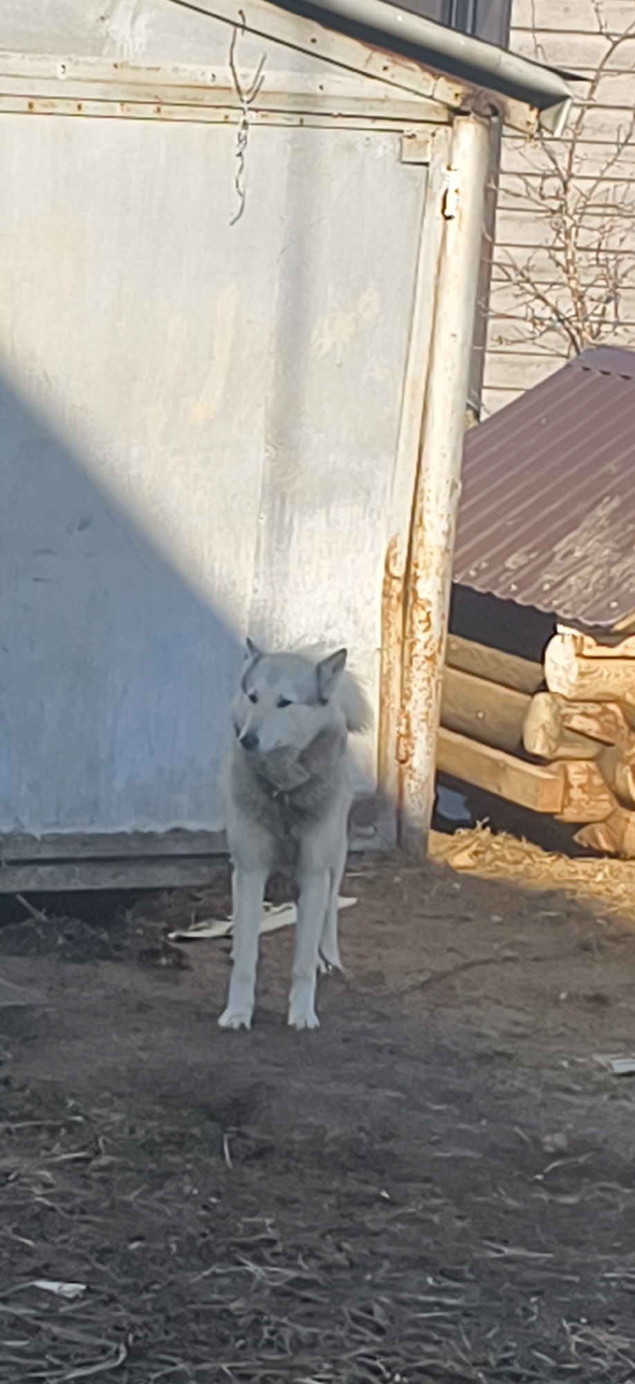 A light grey and white husky-type dog with a black collar stands in dirt in front of a corrugated metal structure with a hanging chain. To the right, a log cabin with a corrugated metal roof is visibl…read more